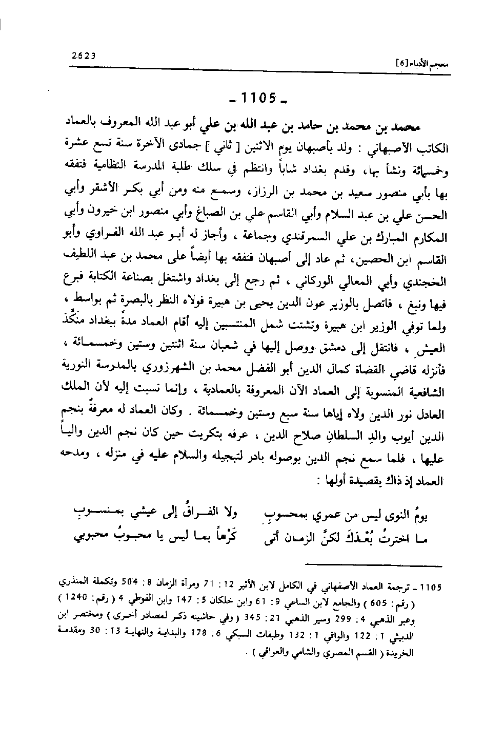 [1105] ترجمة العماد الأصفهاني في الكامل لابن الأثير 12: 71 ومرآة الزمان 8: 504 وتكملة المنذري (رقم: 605) والجامع لابن الساعي 9: 61 وابن خلكان 5: 147 وابن الفوطي 4 (رقم: 1240) وعبر الذهبي 4: 299 وسير الذهبي 21: 345 (وفي حاشيته ذكر لمصادر أخرى) ومختصر ابن الدبيثي 1: 122 والوافي 1: 132 وطبقات السبكي 6: 178 والبداية والنهاية 13: 30 ومقدمة الخريدة (القسم المصري والشامي والعراقي) .