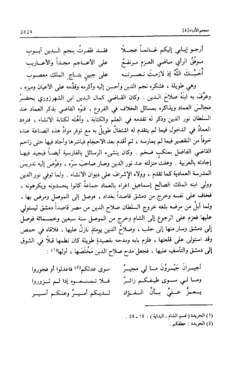وهي طويلة، فشكره نجم الدين وأحسن إليه وأكرمه وقدّمه على الأعيان وميزه، وعرّف به ابنه صلاح الدين. وكان القاضي كمال الدين ابن الشهرزوري يحضر مجالس العماد ويذاكره بمسائل الخلاف في الفروع، فنوّه القاضي بذكر العماد عند السلطان نور الدين وذكر له تقدمه في العلم والكتابة، وأهّله لكتابة الانشاء، فتردد العماد في الدخول فيما لم يتقدم له اشتغال طويل به مع توفر موادّ هذه الصناعة عنده خوفا من التقصير فيما لم يمارسه، ثم أقدم بعد الاحجام فباشرها وأجاد فيها حتى زاحم القاضي الفاضل بمنكب ضخم. وكان ينشىء الرسائل بالفارسية أيضا فيجيد فيها إجادته بالعربية. وعلت منزلته عند نور الدين وصار صاحب سرّه، وفوّض إليه تدريس المدرسة العمادية كما تقدم، وولاه الإشراف على ديوان الانشاء. ولما توفي نور الدين وولي ابنه الملك الصالح إسماعيل اغراه بالعماد جماعة كانوا يحسدونه ويكرهونه، فخاف على نفسه وخرج من دمشق قاصدا بغداد، فوصل إلى الموصل ومرض بها، ولما أبلّ من مرضه بلغه خروج السلطان صلاح الدين من مصر قاصدا دمشق ليستولي عليها فعزم على الرجوع إلى الشام وخرج من الموصل سنة سبعين وخمسمائة فوصل إلى دمشق وسار منها إلى حلب، وصلاح الدين يومئذ نازل عليها، فلاقاه في حمص وقد استولى على قلعتها، فلزم بابه ومدحه بقصيدة طويلة كان نظمها قبلا في الشوق إلى دمشق والتأسف عليها، فجعل مدح صلاح الدين مخلصها، أولها «1» :