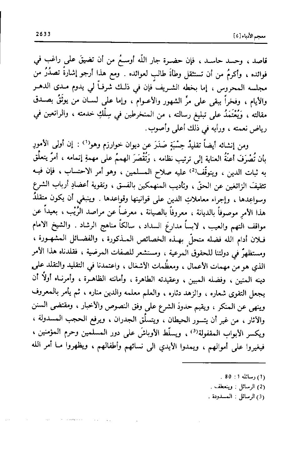 قاصد، وحسد حاسد، فإن حضرة جار الله أوسع من أن تضيق على راغب في فوائده، وأكرم من أن تستثقل وطأة طالب لعوائده. ومع هذا أرجو إشارة تصدر من مجلسه المحروس، إما بخطه الشريف فإن في ذلك شرفا لي يدوم مدى الدهر والأيام، وفخرا يبقى على مرّ الشهور والأعوام، وإما على لسان من يوثق بصدق مقالته، ويعتمد على تبليغ رسالته، من المنخرطين في سلك خدمته، والراتعين في رياض نعمته، ورأيه في ذلك أعلى وأصوب.