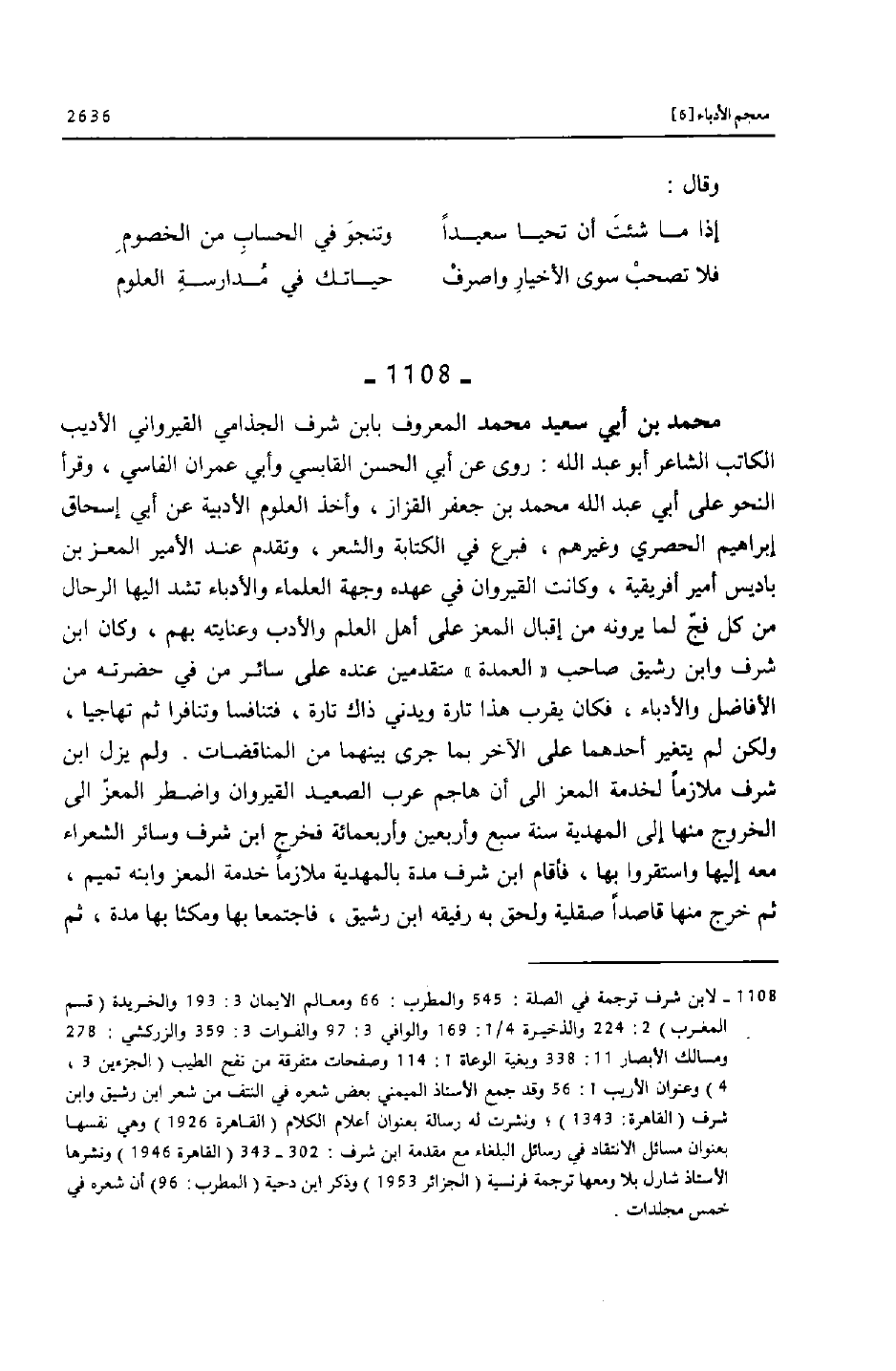 [1108] لابن شرف ترجمة في الصلة: 545 والمطرب: 66 ومعالم الايمان 3: 193 والخريدة (قسم المغرب) 2: 224 والذخيرة 4/1: 169 والوافي 3: 97 والفوات 3: 359 والزركشي: 278 ومسالك الأبصار 11: 338 وبغية الوعاة 1: 114 وصفحات متفرقة من نفح الطيب (الجزءين 3، 4) وعنوان الأريب 1: 56 وقد جمع الأستاذ الميمني بعض شعره في النتف من شعر ابن رشيق وابن شرف (القاهرة: 1343) ؛ ونشرت له رسالة بعنوان أعلام الكلام (القاهرة 1926) وهي نفسها بعنوان مسائل الانتقاد في رسائل البلغاء مع مقدمة ابن شرف: 302- 343 (القاهرة 1946) ونشرها الأستاذ شارل بلا ومعها ترجمة فرنسية (الجزائر 1953) وذكر ابن دحية (المطرب: 96) أن شعره في خمس مجلدات.
