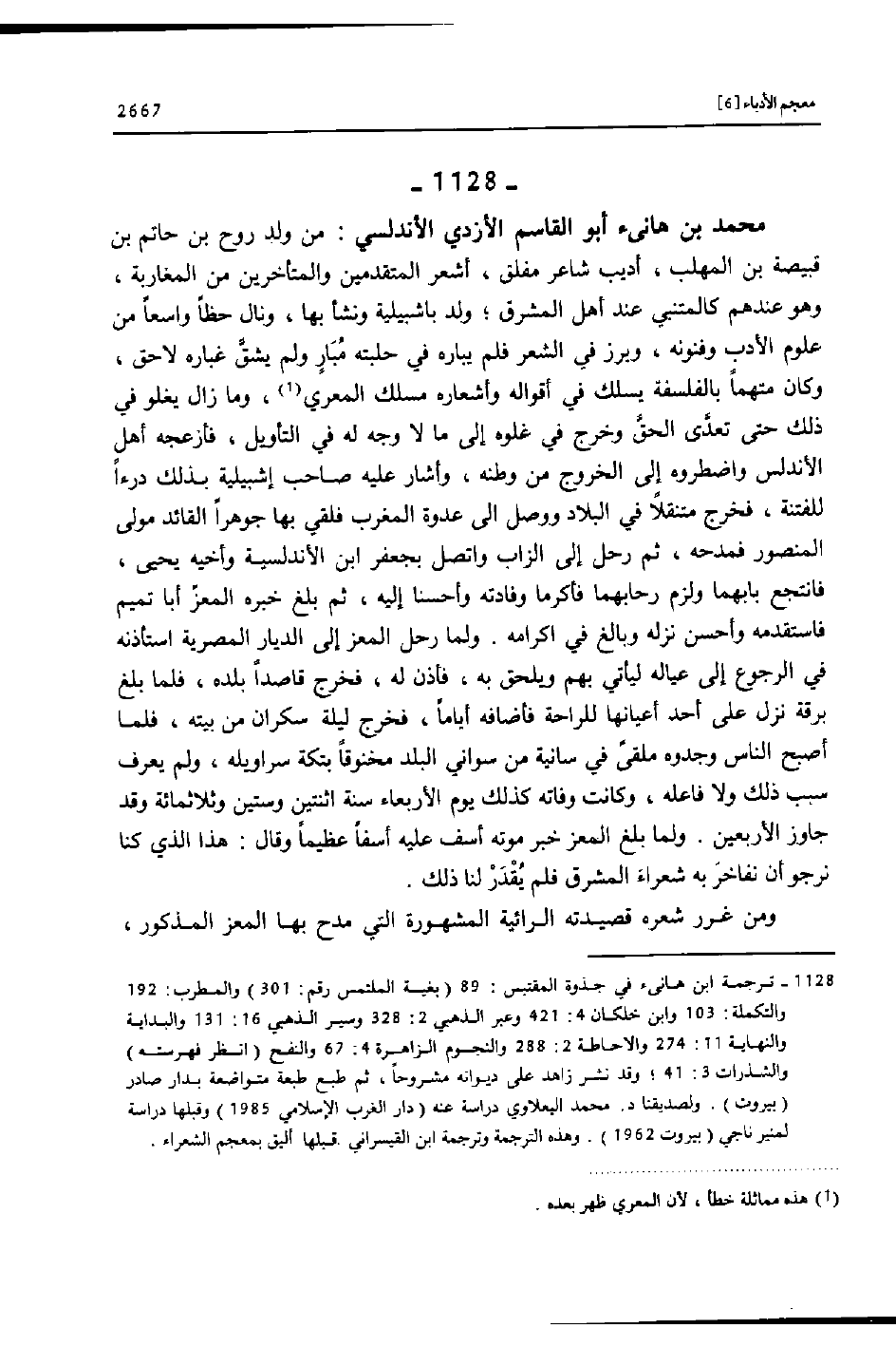 [1128] ترجمة ابن هانىء في جذوة المقتبس: 89 (بغية الملتمس رقم: 301) والمطرب: 192 والتكملة: 103 وابن خلكان 4: 421 وعبر الذهبي 2: 328 وسير الذهبي 16: 131 والبداية والنهاية 11: 274 والاحاطة 2: 288 والنجوم الزاهرة 4: 67 والنفح (انظر فهرسته) والشذرات 3: 41؛ وقد نشر زاهد على ديوانه مشروحا، ثم طبع طبعة متواضعة بدار صادر (بيروت) . ولصديقنا د. محمد اليعلاوي دراسة عنه (دار الغرب الإسلامي 1985) وقبلها دراسة لمنيرناجي (بيروت 1962) . وهذه الترجمة وترجمة ابن القيسراني قبلها أليق بمعجم الشعراء.