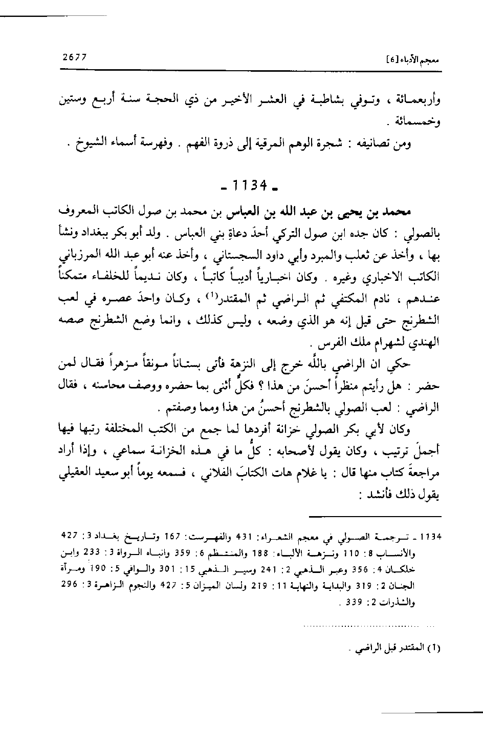 [1134] ترجمة الصولي في معجم الشعراء: 431 والفهرست: 167 وتاريخ بغداد 3: 427 والأنساب 8: 110 ونزهة الألباء: 188 والمنتظم 6: 359 وانباه الرواة 3: 233 وابن خلكان 4: 356 وعبر الذهبي 2: 241 وسير الذهبي 15: 301 والوافي 5: 190 ومرآة الجنان 2: 319 والبداية والنهاية 11: 219 ولسان الميزان 5: 427 والنجوم الزاهرة 3: 296 والشذرات 2: 339.