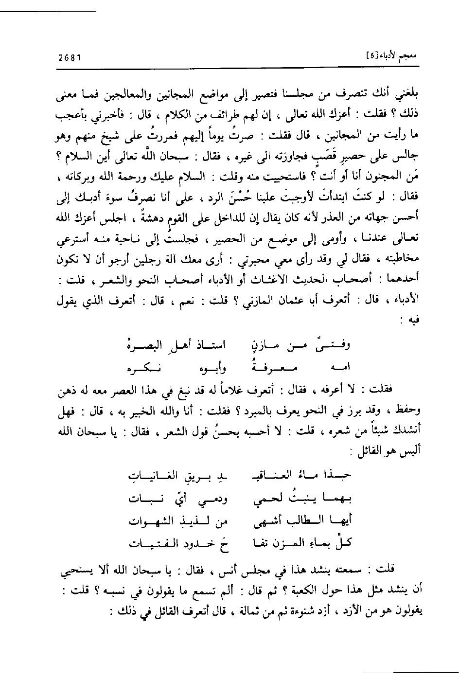 الأدباء، قال: أتعرف أبا عثمان المازني؟ قلت: نعم، قال: أتعرف الذي يقول فيه: