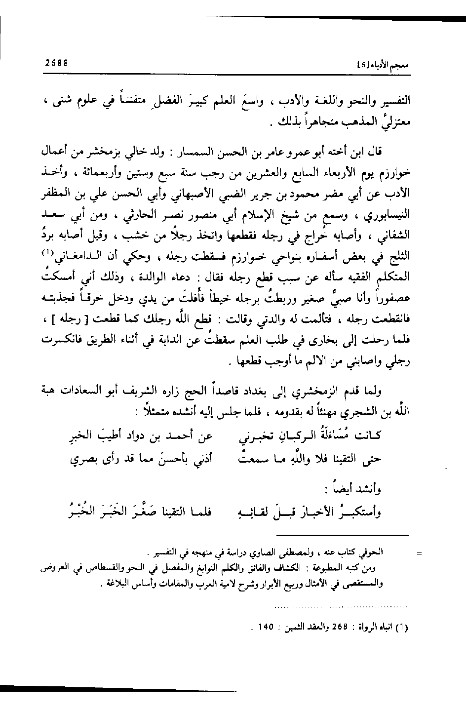 ولما قدم الزمخشري إلى بغداد قاصدا الحج زاره الشريف أبو السعادات هبة الله بن الشجري مهنئا له بقدومه، فلما جلس إليه أنشده متمثلا: