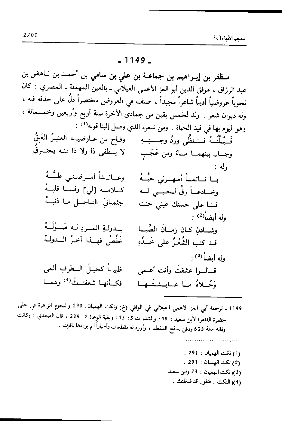 [1149] ترجمة أبي العز الاعمى العيلاني في الوافي (خ) ونكت الهميان: 290 والنجوم الزاهرة في حلى حضرة القاهرة لابن سعيد: 348 والشذرات 5: 115 وبغية الوعاة 2: 289، قال الصفدي: وكانت وفاته سنة 623 ودفن بسفح المقطم؛ وأورد له مقطعات وأخبارا لم يوردها ياقوت.
