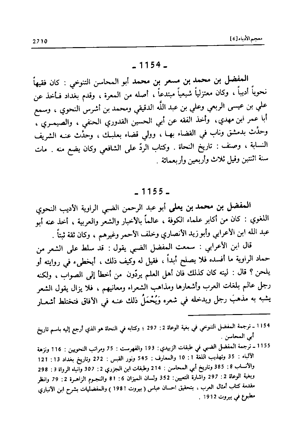 [1154] ترجمة المفضل التنوخي في بغية الوعاة 2: 297؛ وكتابه في النحاة هو الذي أرجع إليه باسم تاريخ أبي المحاسن.