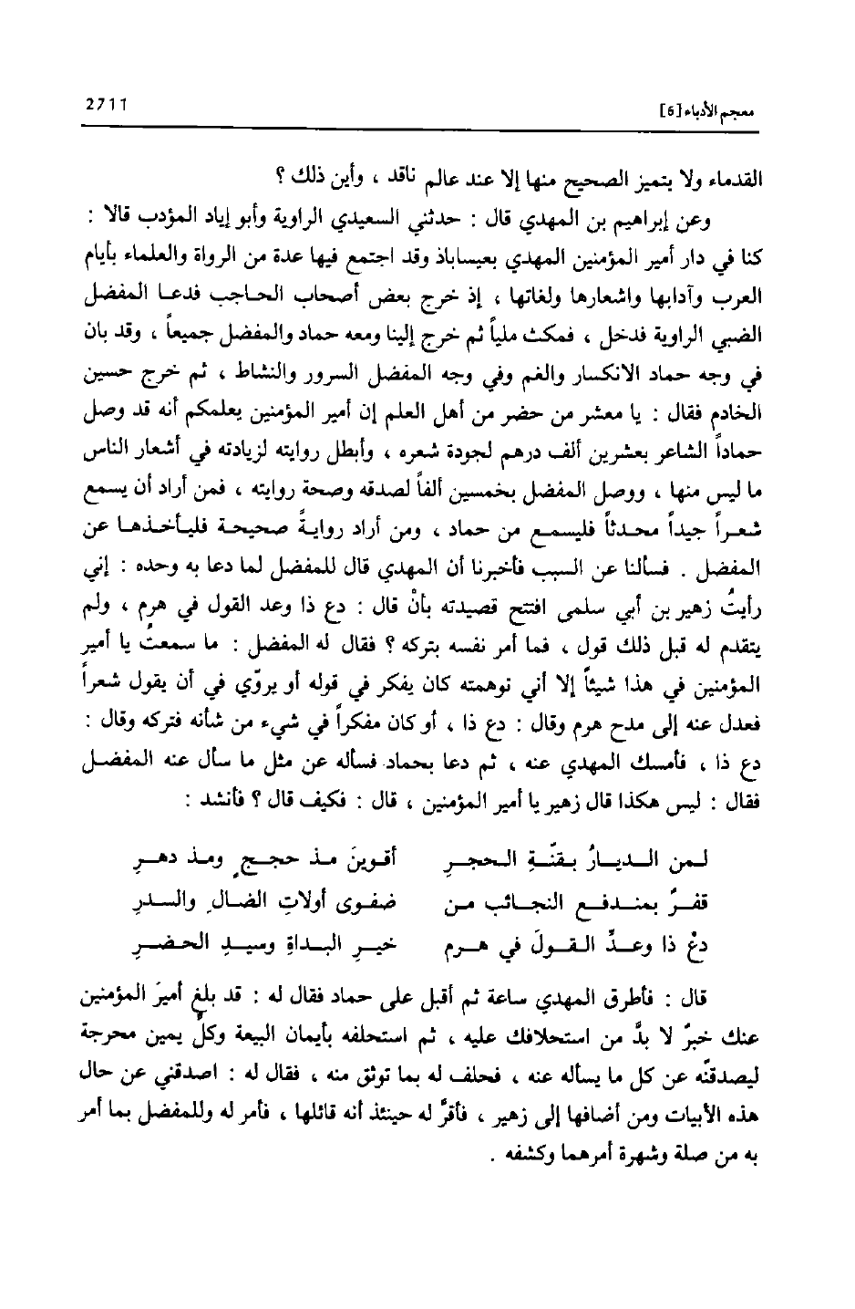 كنا في دار أمير المؤمنين المهدي بعيساباذ وقد اجتمع فيها عدة من الرواة والعلماء بأيام العرب وآدابها واشعارها ولغاتها، إذ خرج بعض أصحاب الحاجب فدعا المفضل الضبي الراوية فدخل، فمكث مليا ثم خرج إلينا ومعه حماد والمفضل جميعا، وقد بان في وجه حماد الانكسار والغم وفي وجه المفضل السرور والنشاط، ثم خرج حسين الخادم فقال: يا معشر من حضر من أهل العلم إن أمير المؤمنين يعلمكم أنه قد وصل حمادا الشاعر بعشرين ألف درهم لجودة شعره، وأبطل روايته لزيادته في أشعار الناس ما ليس منها، ووصل المفضل بخمسين ألفا لصدقه وصحة روايته، فمن أراد أن يسمع شعرا جيدا محدثا فليسمع من حماد، ومن أراد رواية صحيحة فليأخذها عن المفضل. فسألنا عن السبب فأخبرنا أن المهدي قال المفضل لما دعا به وحده: إني رأيت زهير بن أبي سلمى افتتح قصيدته بأن قال: دع ذا وعد القول في هرم، ولم يتقدم له قبل ذلك قول، فما أمر نفسه بتركه؟ فقال له المفضل: ما سمعت يا أمير المؤمنين في هذا شيئا إلا أني توهمته كان يفكر في قوله أو يروّي في أن يقول شعرا فعدل عنه إلى مدح هرم وقال: دع ذا، أو كان مفكرا في شيء من شأنه فتركه وقال: