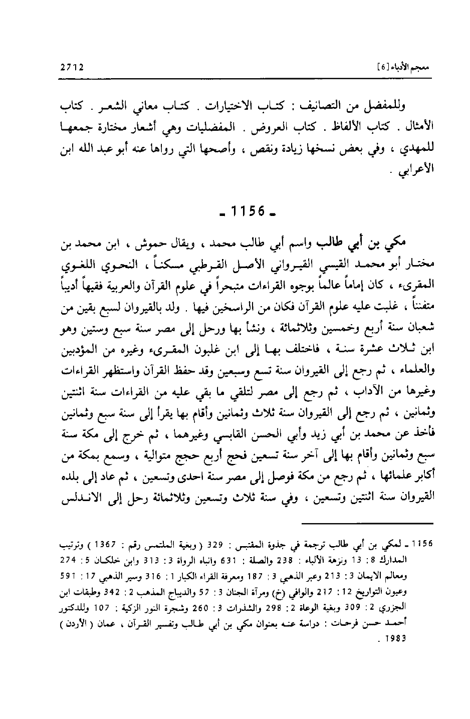 [1156] لمكي بن أبي طالب ترجمة في جذوة المقتبس: 329 (وبغية الملتمس رقم: 1367) وترتيب المدارك 8: 13 ونزهة الألباء: 238 والصلة: 631 وانباه الرواة 3: 313 وابن خلكان 5: 274 ومعالم الايمان 3: 213 وعبر الذهبي 3: 187 ومعرفة القراء الكبار 1: 316 وسير الذهبي 17: 591 وعيون التواريخ 12: 217 والوافي (خ) ومرآة الجنان 3: 57 والديباج المذهب 2: 342 وطبقات ابن الجزري 2: 309 وبغية الوعاة 2: 298 والشذرات 3: 260 وشجرة النور الزكية: 107 وللدكتور أحمد حسن فرحات: دراسة عنه بعنوان مكي بن أبي طالب وتفسير القرآن، عمان (الأردن) 1983.