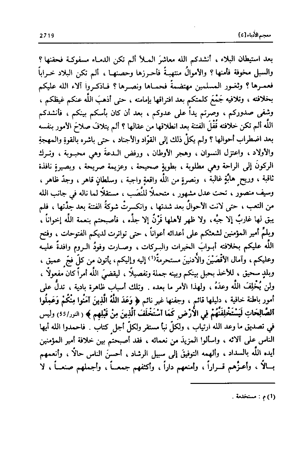 (النور/ 55) وليس في تصديق ما وعد الله ارتياب، ولكلّ نبأ مستقر ولكلّ أجل كتاب. فاحمدوا الله أيها الناس على آلائه، واسألوا المزيد من نعمائه، فقد أصبحتم بين خلافة أمير المؤمنين أيده الله بالسداد، وألهمه التوفيق إلى سبيل الرشاد، أحسن الناس حالا، وأنعمهم بالا، وأعزّهم قرارا، وأمنعهم دارا، وأكثفهم جمعا، وأجملهم صنعا، لا