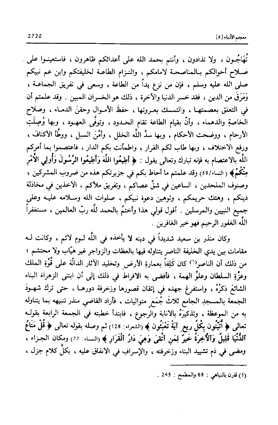 (النساء/ 59) وقد علمتم ما أحاط بكم في جزيرتكم هذه من ضروب المشركين، وصنوف الملحدين، الساعين في شقّ عصاكم، وتفريق ملأكم، الآخذين في مخاذلة دينكم، وهتك حريمكم، وتوهين دعوة نبيكم، صلوات الله وسلامه عليه وعلى جميع النبيين والمرسلين. أقول قولي هذا وأختم بالحمد لله ربّ العالمين، مستغفرا الله الغفور الرحيم فهو خير الغافرين.