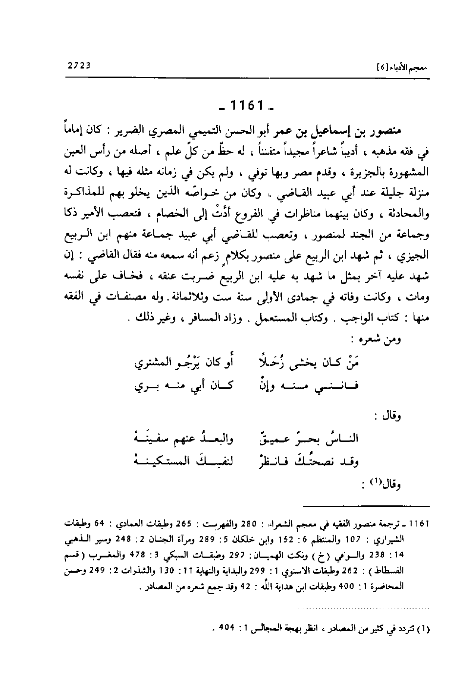 [1161] ترجمة منصور الفقيه في معجم الشعراء: 280 والفهرست: 265 وطبقات العمادي: 64 وطبقات الشيرازي: 107 والمنتظم 6: 152 وابن خلكان 5: 289 ومرآة الجنان 2: 248 وسير الذهبي 14: 238 والوافي (خ) ونكت الهميان: 297 وطبقات السبكي 3: 478 والمغرب (قسم الفسطاط) : 262 وطبقات الاسنوي 1: 299 والبداية والنهاية 11: 130 والشذرات 2: 249 وحسن المحاضرة 1: 400 وطبقات ابن هداية الله: 42 وقد جمع شعره من المصادر.