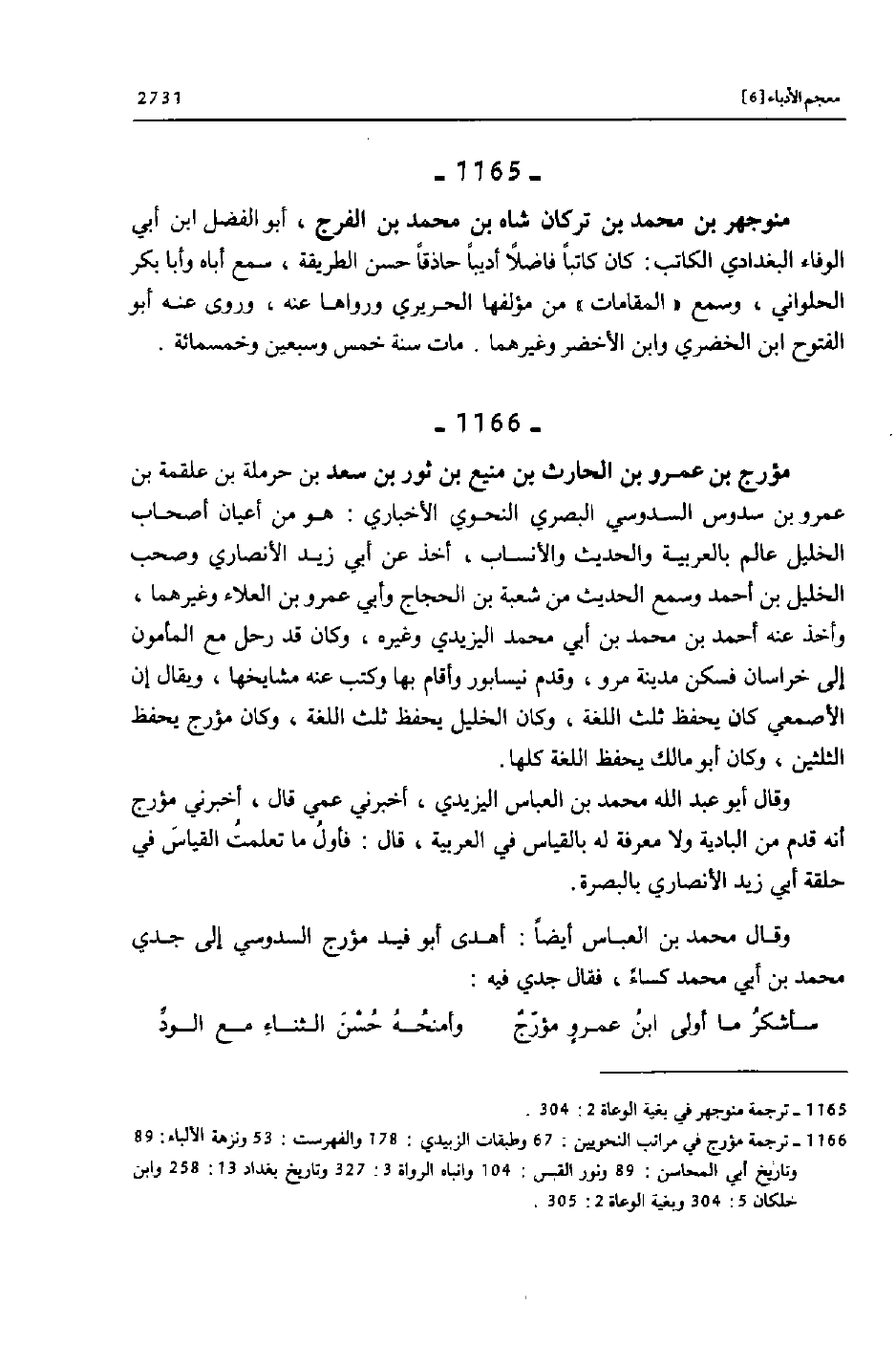 [1166] ترجمة مؤرج في مراتب النحويين: 67 وطبقات الزبيدي: 178 والفهرست: 53 ونزهة الألباء: 89 وتاريخ أبي المحاسن: 89 ونور القبس: 104 وانباه الرواة 3: 327 وتاريخ بغداد 13: 258 وابن خلكان 5: 304 وبغية الوعاة 2: 305.