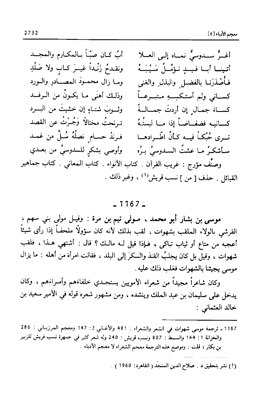 [1167] ترجمة موسى شهوات في الشعر والشعراء: 481 والأغاني 3: 147 ومعجم المرزباني: 286 والخزانة 1: 144 والسمط: 807 ونسب قريش: 240 وله شعر كثير في جمهرة نسب قريش للزبير بن بكار؛ قلت: وموضع هذه الترجمة معجم الشعراء لا معجم الأدباء.