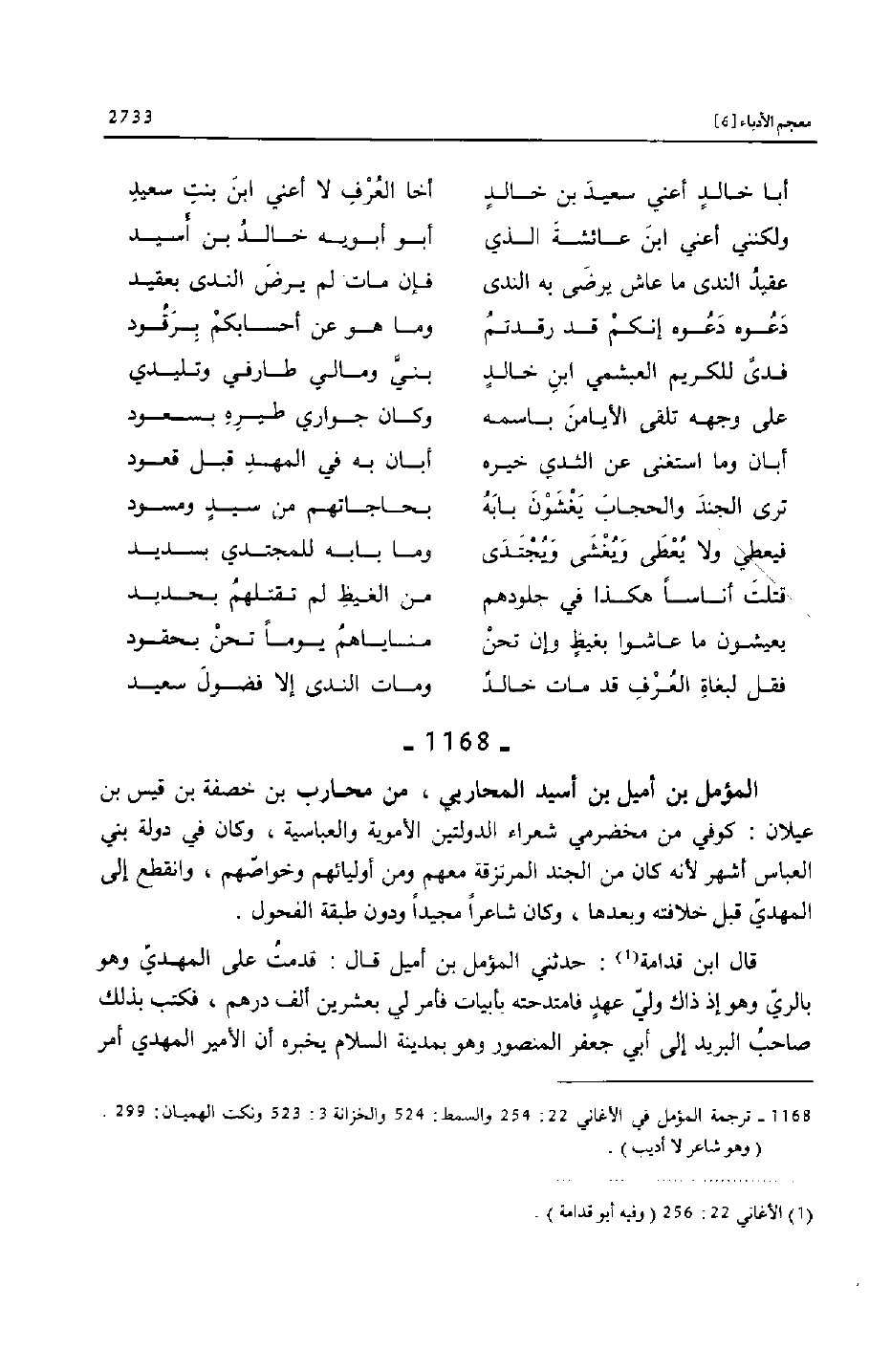 [1168] ترجمة المؤمل في الأغاني 22: 254 والسمط: 524 والخزانة 3: 523 ونكت الهميان: 299.