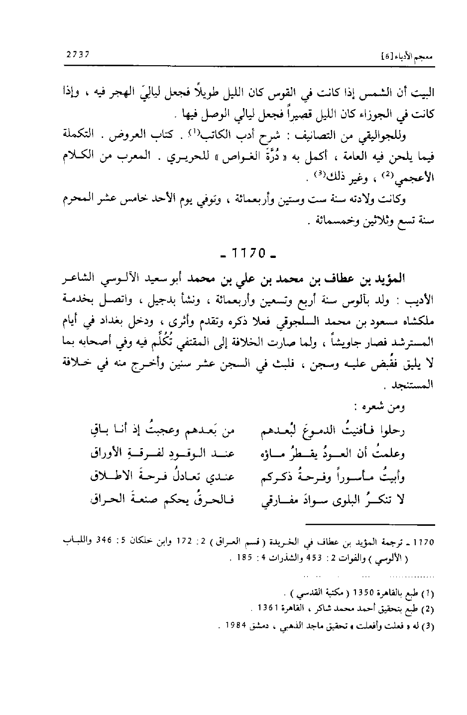 [1170] ترجمة المؤيد بن عطاف في الخريدة (قسم العراق) 2: 172 وابن خلكان 5: 346 واللباب (الألوسي) والفوات 2: 453 والشذرات 4: 185.