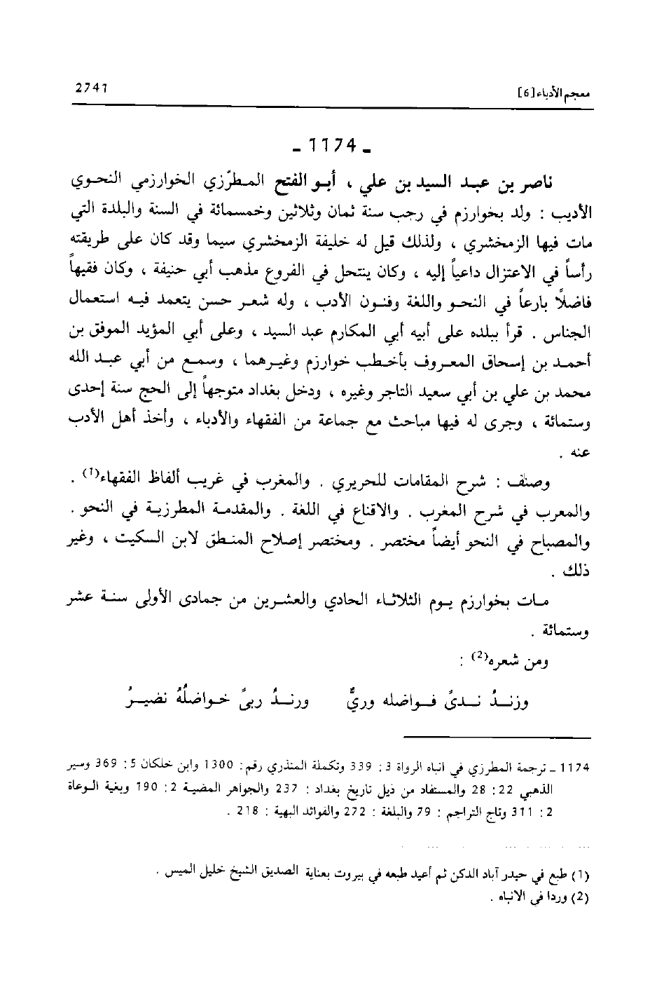 [1174] ترجمة المطرزي في انباه الرواة 3: 339 وتكملة المنذري رقم: 1300 وابن خلكان 5: 369 وسير الذهبي 22: 28 والمستفاد من ذيل تاريخ بغداد: 237 والجواهر المضية 2: 190 وبغية الوعاة 2: 311 وتاج التراجم: 79 والبلغة: 272 والفوائد البهية: 218.