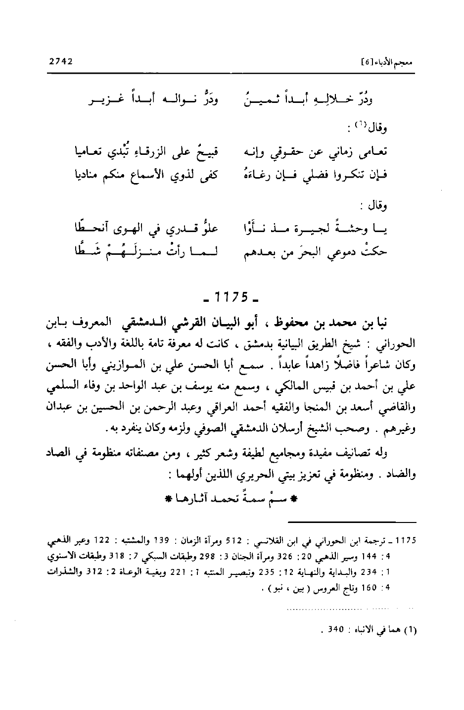 [1175] ترجمة ابن الحوراني في ابن القلانسي: 512 ومرآة الزمان: 139 والمشتبه: 122 وعبر الذهبي 4: 144 وسير الذهبي 20: 326 ومرآة الجنان 3: 298 وطبقات السبكي 7: 318 وطبقات الاسنوي 1: 234 والبداية والنهاية 12: 235 وتبصير المنتبه 1: 221 وبغية الوعاة 2: 312 والشذرات 4: 160 وتاج العروس (بين، نبو) .