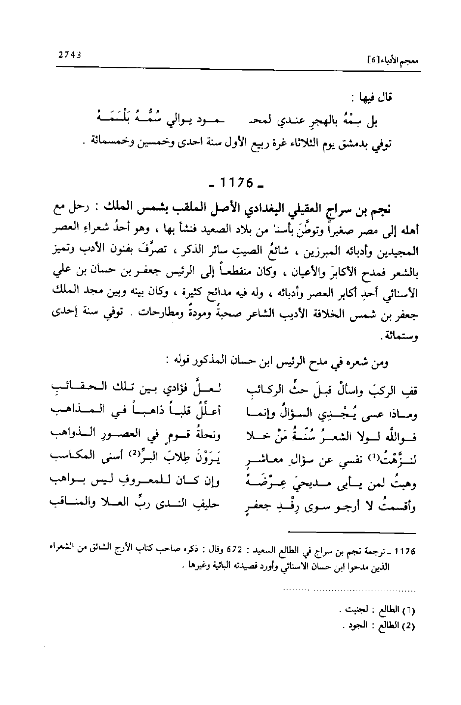 [1176] ترجمة نجم بن سراج في الطالع السعيد: 672 وقال: ذكره صاحب كتاب الأرج الشائق من الشعراء الذين مدحوا ابن حسان الاسنائي وأورد قصيدته البائية وغيرها.