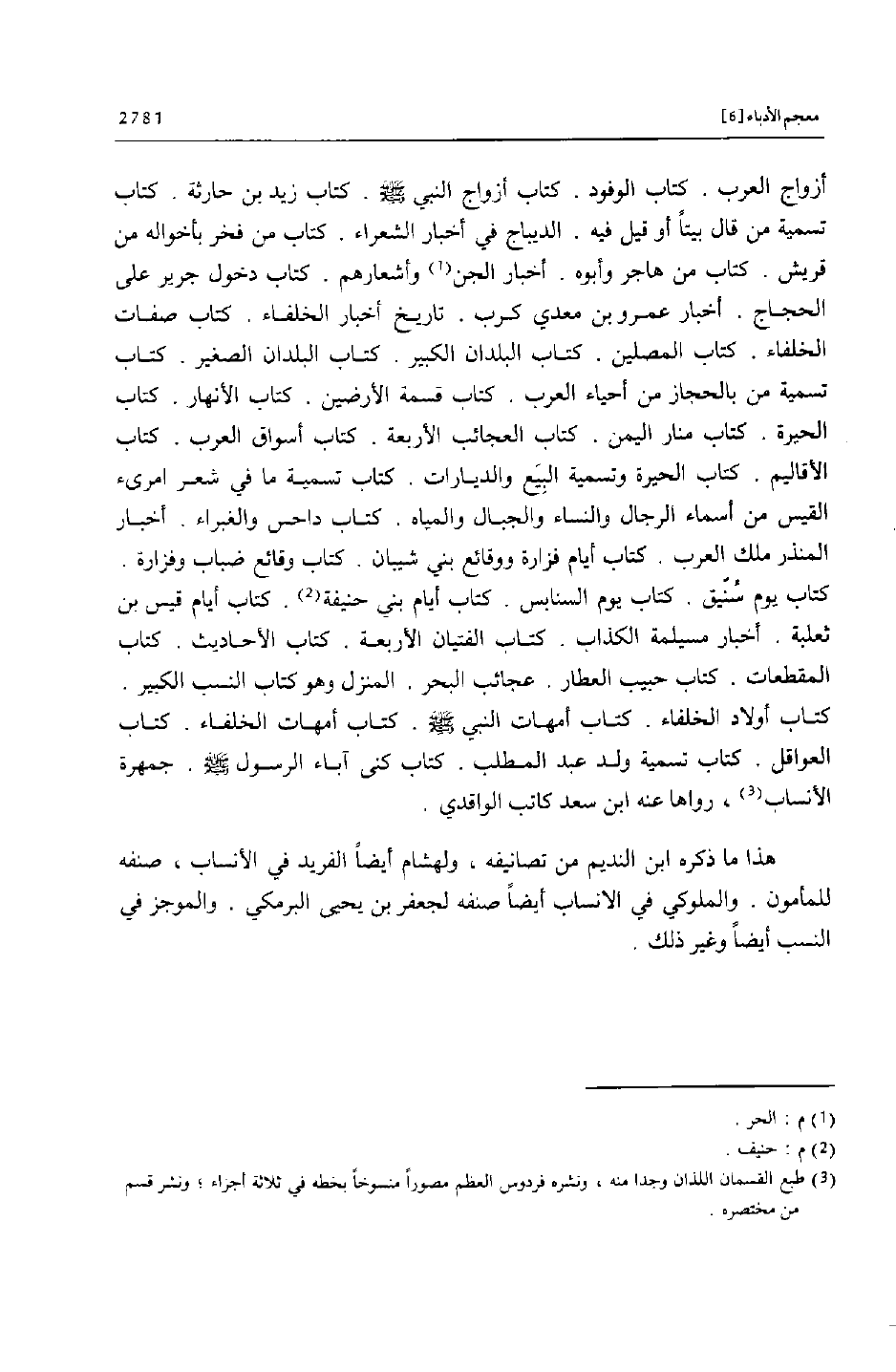 هذا ما ذكره ابن النديم من تصانيفه، ولهشام أيضا الفريد في الأنساب، صنفه للمأمون. والملوكي في الانساب أيضا صنفه لجعفر بن يحيى البرمكي. والموجز في النسب أيضا وغير ذلك.