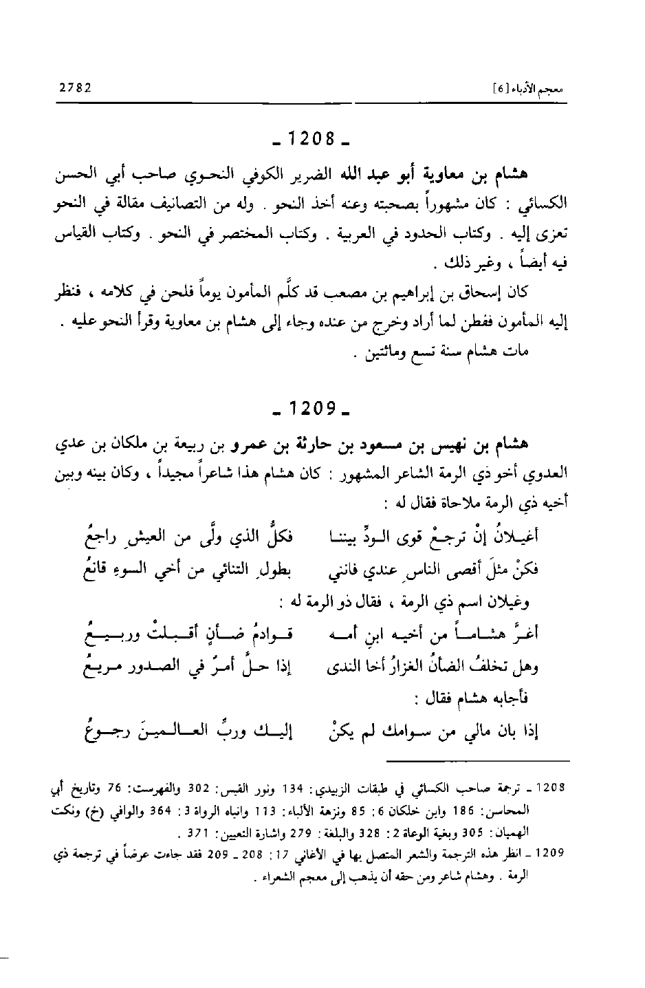 [1209] انظر هذه الترجمة والشعر المتصل بها في الأغاني 17: 208- 209 فقد جاءت عرضا في ترجمة ذي الرمة. وهشام شاعر ومن حقه أن يذهب إلى معجم الشعراء.