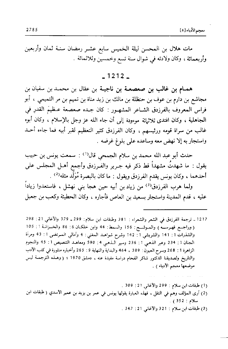 [1217] ترجمة الفرزدق في الشعر والشعراء: 381 وطبقات ابن سلام: 299- 379 والأغاني 21: 298 (وراجع فهرسه) والموشح: 156 والسمط: 44 وابن خلكان 6: 86 والخزانة 1: 105 والشذرات 1: 141 والشريشي 1: 142 وشرح شواهد المغني: 4 وأمالي المرتضى 1: 43 ومرآة الجنان 1: 234 وعبر الذهبي 1: 236 وسير الذهبي 4: 590 ومعاهد التنصيص 1: 45 والنجوم الزاهرة 1: 268 وسرح العيون: 389، 464 والبداية والنهاية 9: 265 وأخباره منثورة في كتب الأدب والتاريخ ولصديقنا الدكتور شاكر الفحام دراسة مفيدة عنه، دمشق 1970؛ (وهذه الترجمة ليس موضعها معجم الأدباء) .