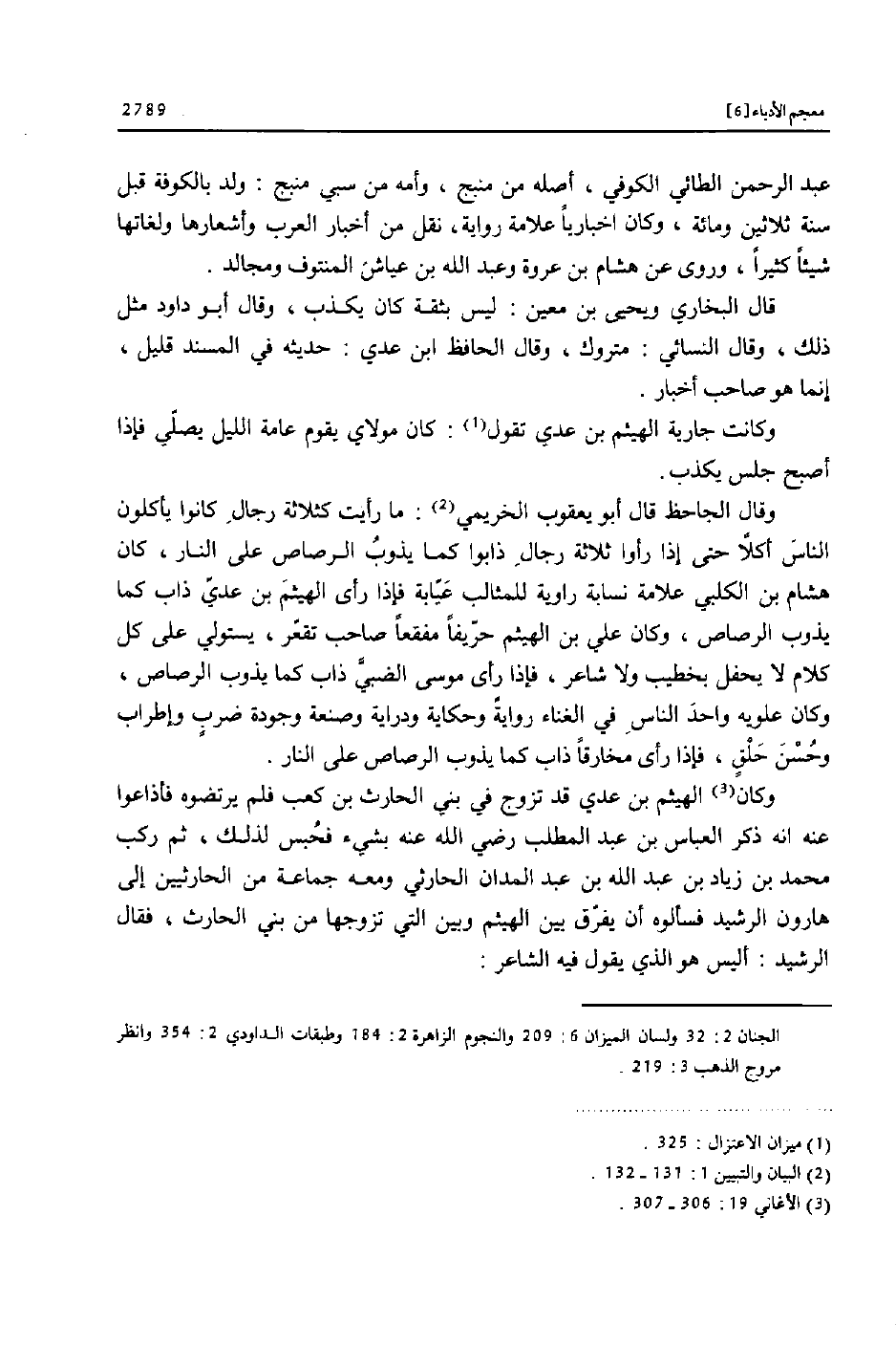 وكان «3» الهيثم بن عدي قد تزوج في بني الحارث بن كعب فلم يرتضوه فأذاعوا عنه انه ذكر العباس بن عبد المطلب رضي الله عنه بشيء فحبس لذلك، ثم ركب محمد بن زياد بن عبد الله بن عبد المدان الحارثي ومعه جماعة من الحارثيين إلى هارون الرشيد فسألوه أن يفرّق بين الهيثم وبين التي تزوجها من بني الحارث، فقال الرشيد: أليس هو الذي يقول فيه الشاعر: