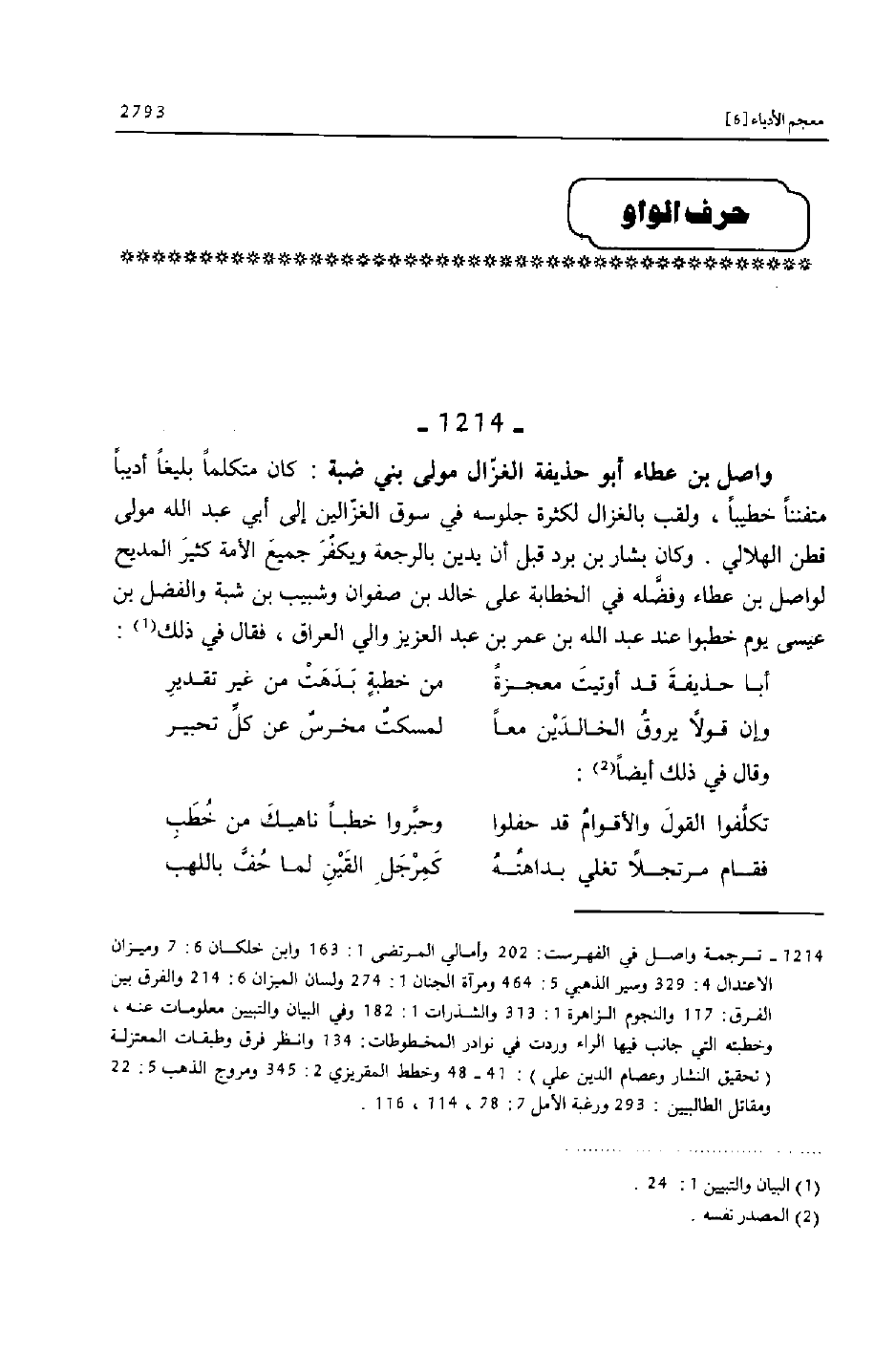 [1214] ترجمة واصل في الفهرست: 202 وأمالي المرتضى 1: 163 وابن خلكان 6: 7 وميزان الاعتدال 4: 329 وسير الذهبي 5: 464 ومرآة الجنان 1: 274 ولسان الميزان 6: 214 والفرق بين الفرق: 117 والنجوم الزاهرة 1: 313 والشذرات 1: 182 وفي البيان والتبيين معلومات عنه، وخطبته التي جانب فيها الراء وردت في نوادر المخطوطات: 134 وانظر فرق وطبقات المعتزلة (تحقيق النشار وعصام الدين علي) : 41- 48 وخطط المقريزي 2: 345 ومروج الذهب 5: 22 ومقاتل الطالبيين: 293 ورغبة الآمل 7: 78، 114، 116.