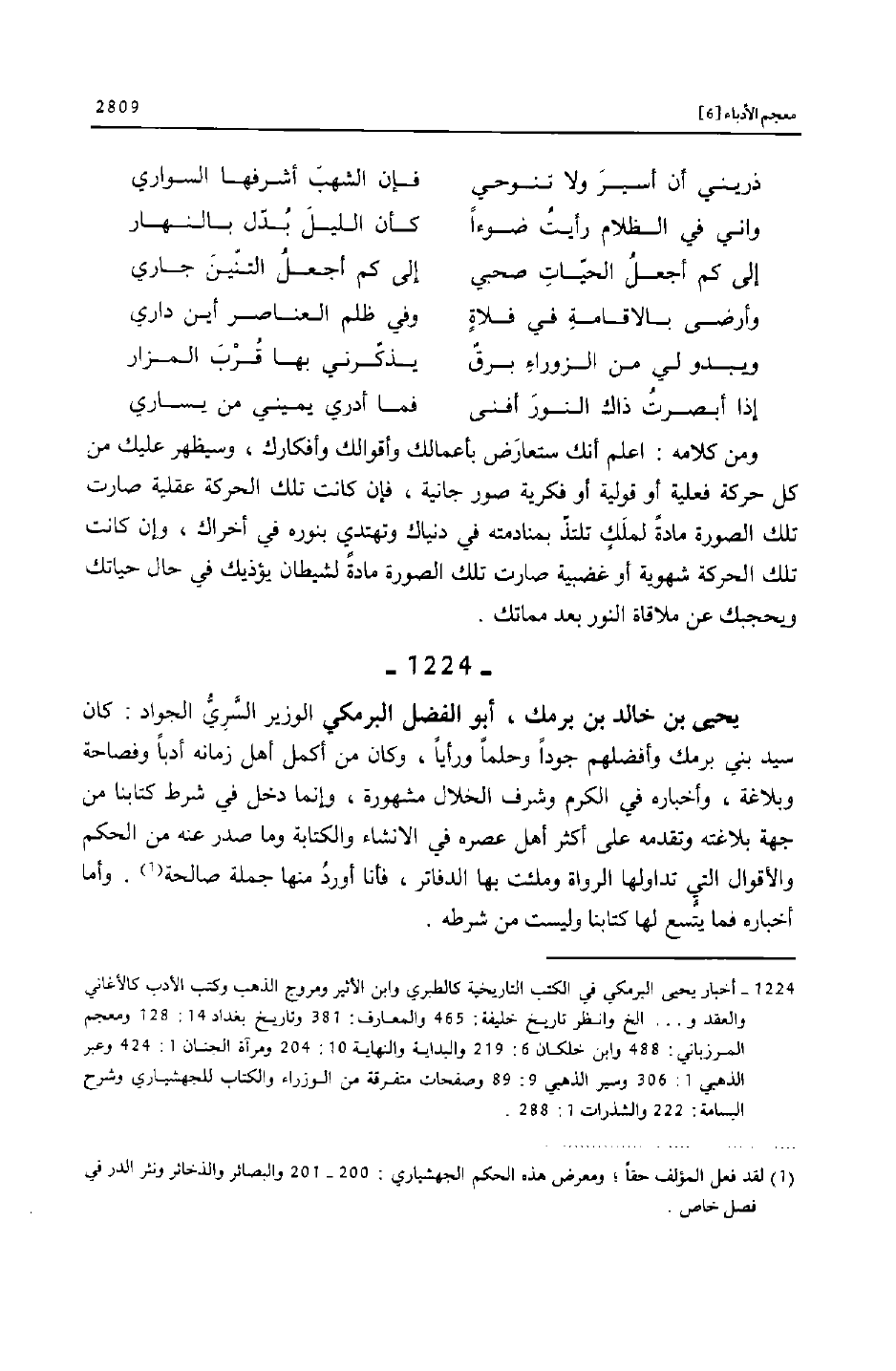 [1224] أخبار يحيى البرمكي في الكتب التاريخية كالطبري وابن الأثير ومروج الذهب وكتب الأدب كالأغاني والعقد و ... الخ وانظر تاريخ خليفة: 465 والمعارف: 381 وتاريخ بغداد 14: 128 ومعجم المرزباني: 488 وابن خلكان 6: 219 والبداية والنهاية 10: 204 ومرآة الجنان 1: 424 وعبر الذهبي 1: 306 وسير الذهبي 9: 89 وصفحات متفرقة من الوزراء والكتاب للجهشياري وشرح البسامة: 222 والشذرات 1: 288.