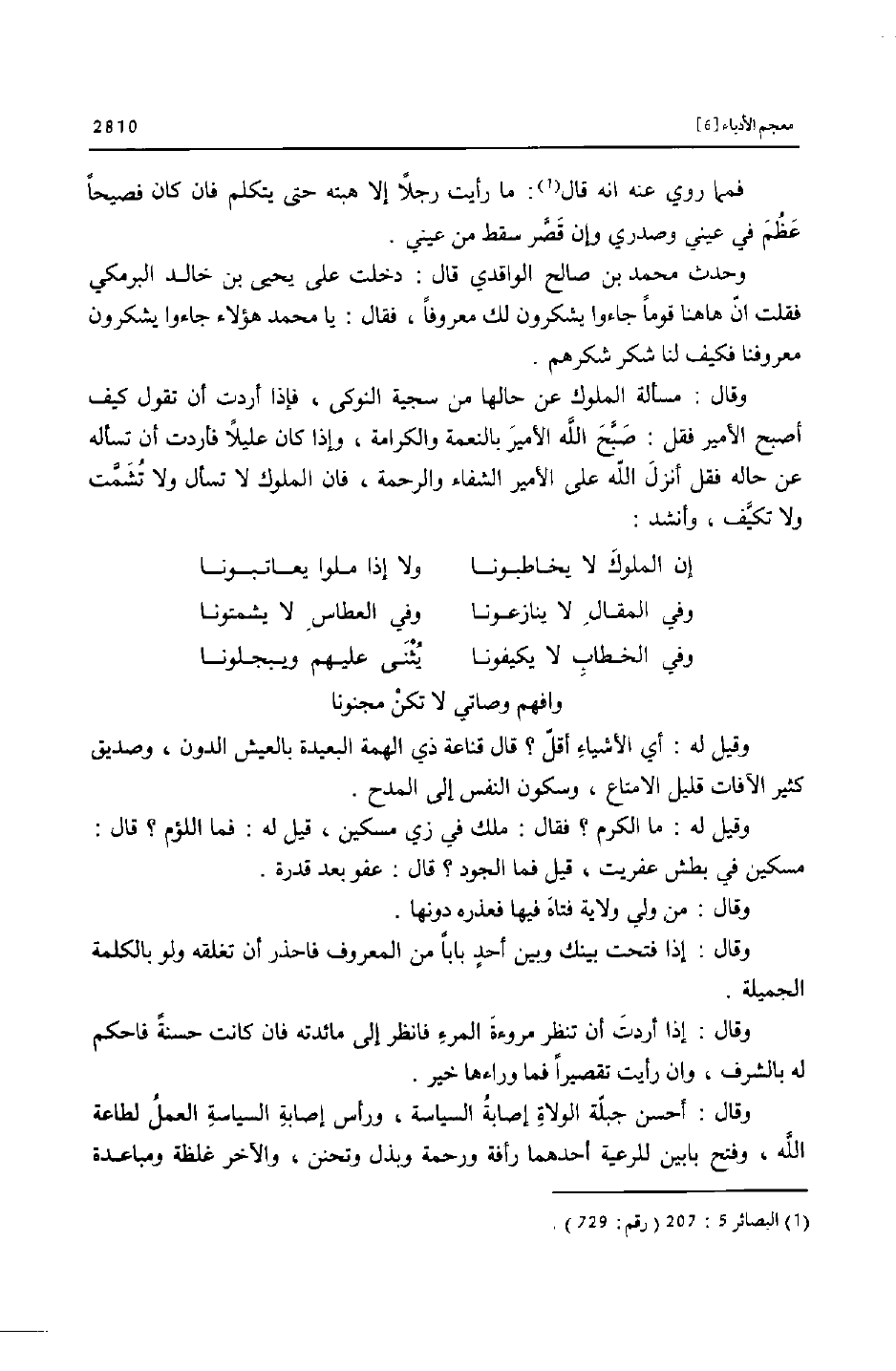 وقال: مسألة الملوك عن حالها من سجية النوكى، فإذا أردت أن تقول كيف أصبح الأمير فقل: صبّح الله الأمير بالنعمة والكرامة، وإذا كان عليلا فأردت أن تسأله عن حاله فقل أنزل الله على الأمير الشفاء والرحمة، فان الملوك لا تسأل ولا تشمّت ولا تكيّف، وأنشد: