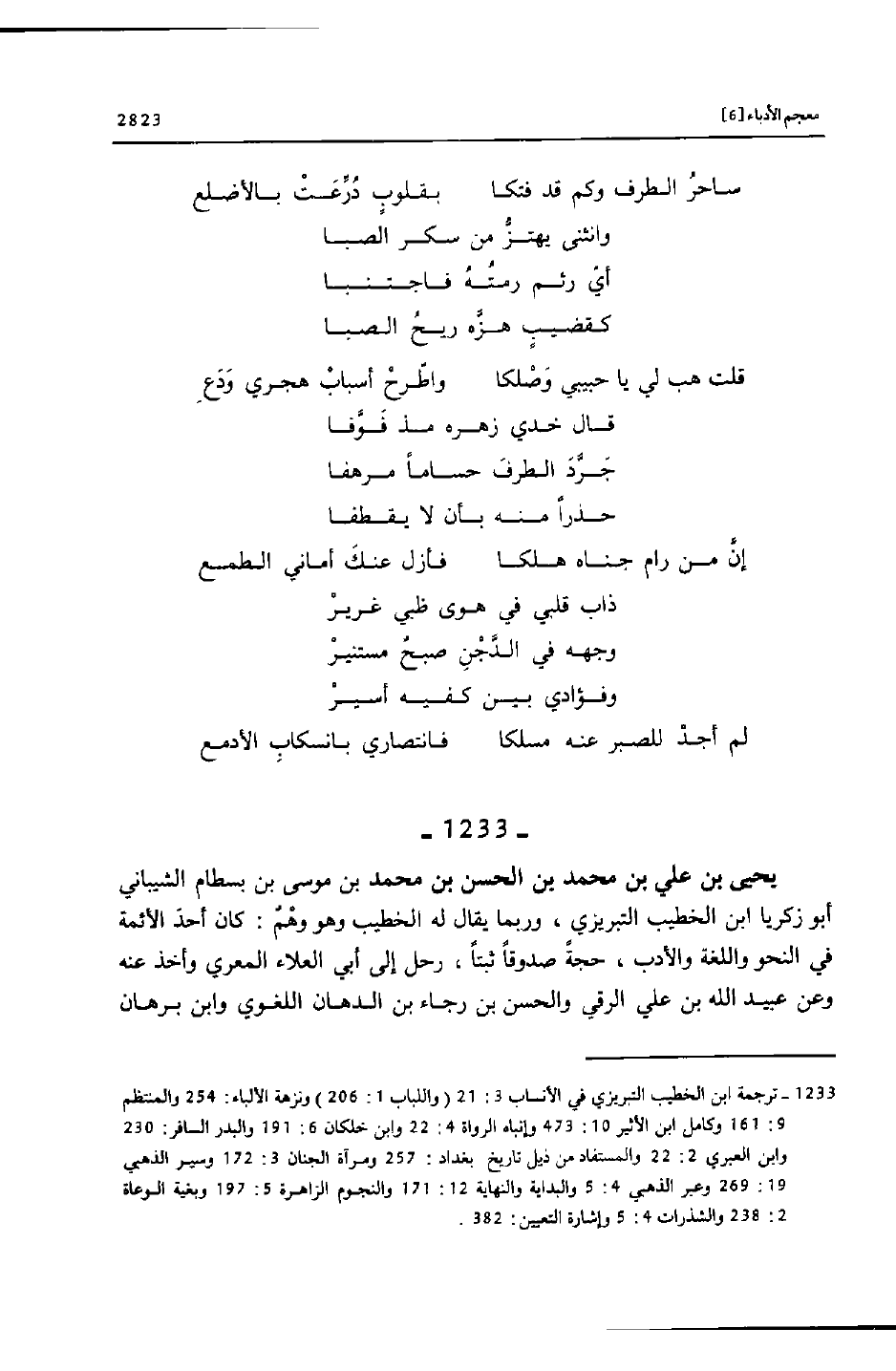 [1233] ترجمة ابن الخطيب التبريزي في الأنساب 3: 21 (واللباب 1: 206) ونزهة الألباء: 254 والمنتظم 9: 161 وكامل ابن الأثير 10: 473 وإنباه الرواة 4: 22 وابن خلكان 6: 191 والبدر السافر: 230 وابن العبري 2: 22 والمستفاد من ذيل تاريخ بغداد: 257 ومرآة الجنان 3: 172 وسير الذهبي 19: 269 وعبر الذهبي 4: 5 والبداية والنهاية 12: 171 والنجوم الزاهرة 5: 197 وبغية الوعاة 2: 238 والشذرات 4: 5 وإشارة التعيين: 382.