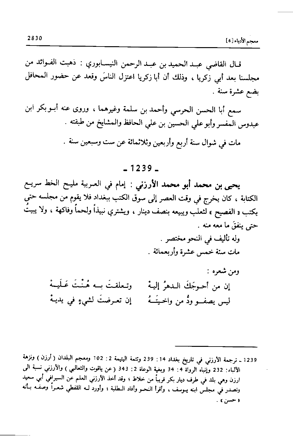 [1239] ترجمة الأرزني في تاريخ بغداد 14: 239 وتتمة اليتيمة 2: 102 ومعجم البلدان (أرزن) ونزهة الألباء: 232 وإنباه الرواة 4: 34 وبغية الوعاة 2: 343 (عن ياقوت والثعالبي) والأرزني نسبة الى ارزن وهي بلد في طرف ديار بكر قريبا من خلاط؛ وقد أخذ الأرزني العلم عن السيرافي أبي سعيد وتصدر في مجلس ابنه يوسف، وأقرأ النحو وأفاد الطلبة؛ وأورد له القفطي شعرا وصفه بأنه «حسن» .