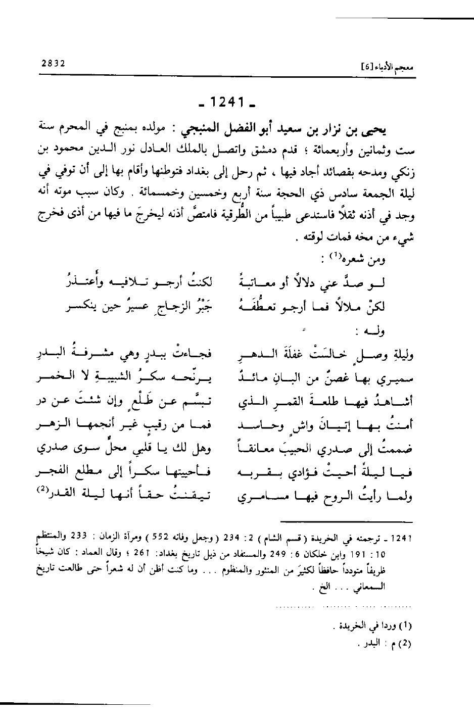 [1241] ترجمته في الخريدة (قسم الشام) 2: 234 (وجعل وفاته 552) ومرآة الزمان: 233 والمنتظم 10: 191 وابن خلكان 6: 249 والمستفاد من ذيل تاريخ بغداد: 261؛ وقال العماد: كان شيخا ظريفا متوددا حافظا لكثير من المنثور والمنظوم ... وما كنت أظن أن له شعرا حتى طالعت تاريخ السمعاني ... الخ.