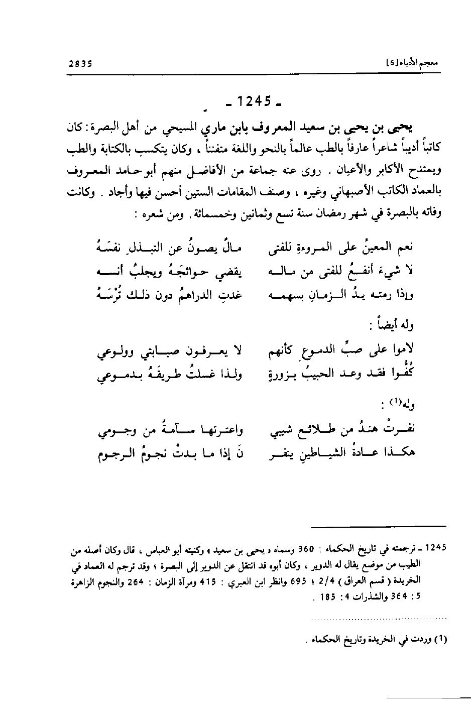 [1245] ترجمته في تاريخ الحكماء: 360 وسماه «يحيى بن سعيد» وكنيته أبو العباس، قال وكان أصله من الطيب من موضع يقال له الدوير، وكان أبوه قد انتقل عن الدوير إلى البصرة؛ وقد ترجم له العماد في الخريدة (قسم العراق) 4/2؛ 695 وانظر ابن العبري: 415 ومرآة الزمان: 264 والنجوم الزاهرة 5: 364 والشذرات 4: 185.