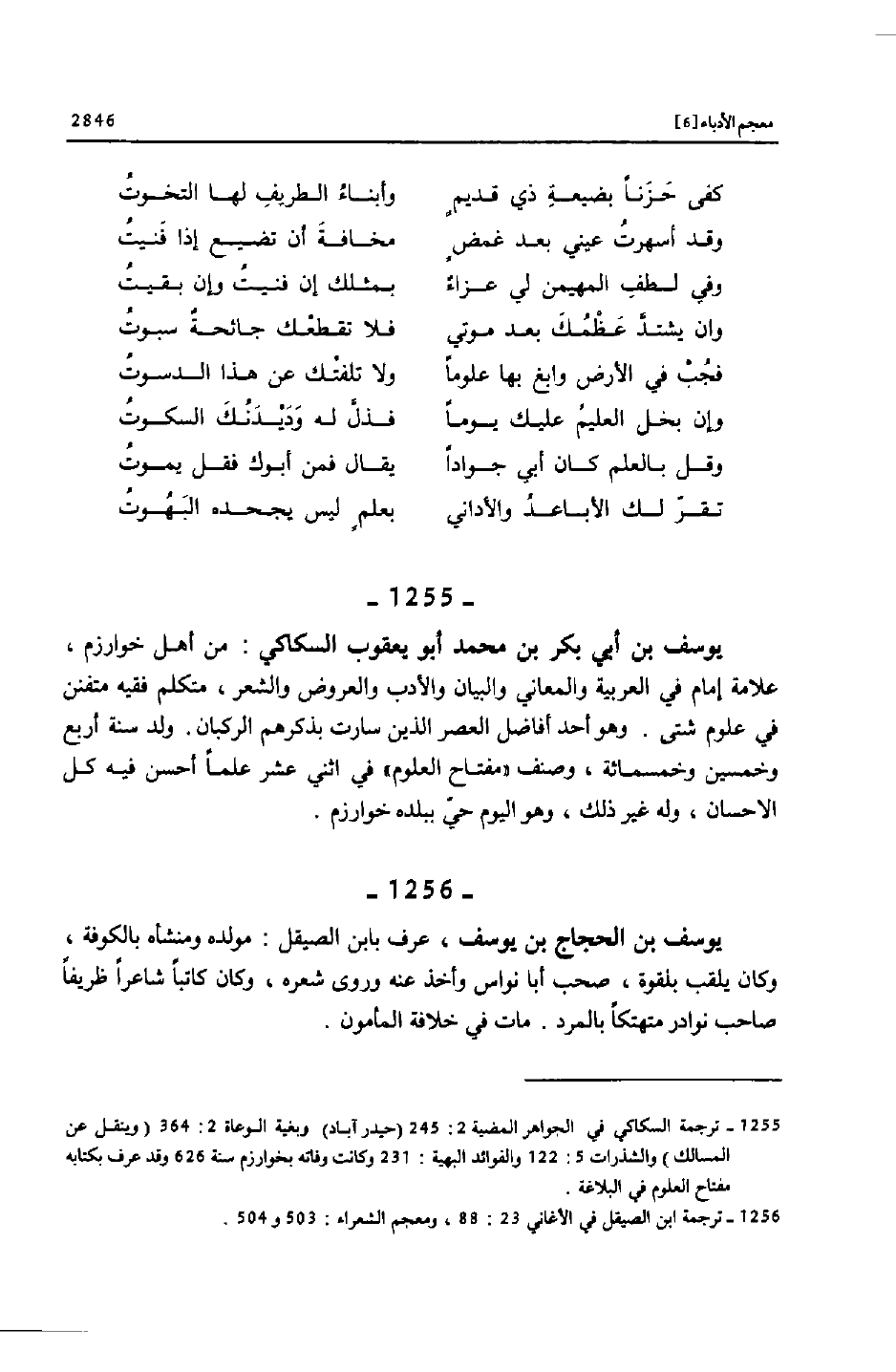 [1255] ترجمة السكاكي في الجواهر المضية 2: 245 (حيدر آباد) وبغية الوعاة 2: 364 (وينقل عن المسالك) والشذرات 5: 122 والفوائد البهية: 231 وكانت وفاته بخوارزم سنة 626 وقد عرف بكتابه مفتاح العلوم في البلاغة.