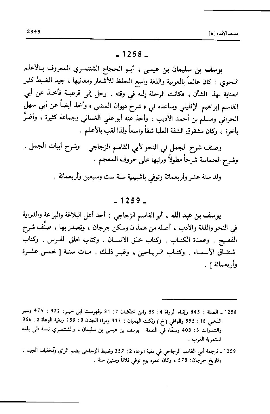 [1258] الصلة: 643 وإنباه الرواة 4: 59 وابن خلكان 7: 81 وفهرست ابن خير: 472، 475 وسير الذهبي 18: 555 والوافي (خ) ونكت الهميان: 313 ومرآة الجنان 3: 159 وبغية الوعاة 2: 356 والشذرات 3: 403 وسمّاه في الصلة: يوسف بن عيسى بن سليمان، والشنتمري نسبة الى بلده شنتمرية الغرب.