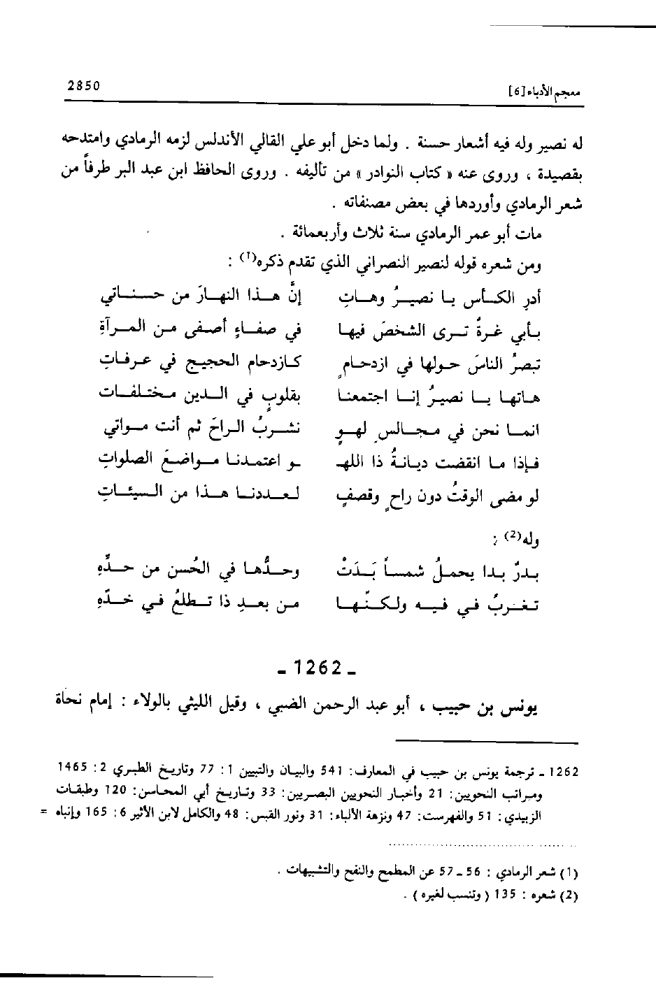 [1262] ترجمة يونس بن حبيب في المعارف: 541 والبيان والتبيين 1: 77 وتاريخ الطبري 2: 1465 ومراتب النحويين: 21 وأخبار النحويين البصريين: 33 وتاريخ أبي المحاسن: 120 وطبقات الزبيدي: 51 والفهرست: 47 ونزهة الألباء: 31 ونور القبس: 48 والكامل لابن الأثير 6: 165 وإنباه