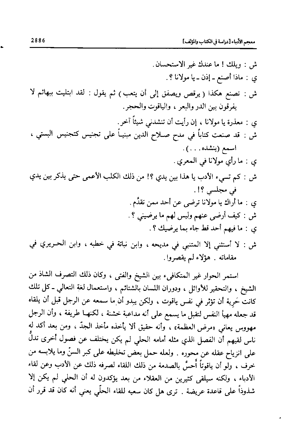 استمر الحوار غير المتكافىء بين الشيخ والفتى، وكان ذلك التصرف الشاذ من الشيخ، والتحقير للأوائل، ودوران اللسان بالشتائم، واستعمال لغة التعالي- كل تلك كانت حرية أن تؤثر في نفس ياقوت، ولكن يبدو أن ما سمعه عن الرجل قبل أن يلقاه قد جعله مهيأ النفس لتقبل ما يسمع على أنه مداعبة خشنة، لكنها طريفة، وأن الرجل مهووس يعاني «مرض العظمة» ، وأنه حقيق ألا يأخذه مأخذ الجدّ، ومن بعد أكد له ناس لقيهم أن الفصل الذي مثله أمامه الحلي لم يكن يختلف عن فصول أخرى تدلّ على انزياح عقله عن محوره. ولعله حمل بعض تخليطه على كبر السنّ وما يلابسه من خرف، ولو أن ياقوتا أحسّ بالصدمة من ذلك اللقاء لصرفه ذلك عن الأدب وعن لقاء الأدباء، ولكنه سيلقى كثيرين من العقلاء من بعد يؤكدون له أن الحلي لم يكن إلا شذوذا على قاعدة عريضة. ترى هل كان سعيه للقاء الحلّي يعني أنه كان قد قرر أن