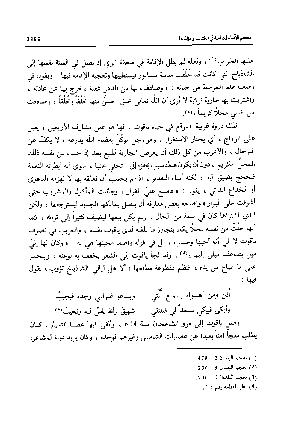 تلك ذروة غريبة الموقع في حياة ياقوت، فها هو على مشارف الأربعين، يقبل على الزواج، أي يختار الاستقرار، وهو رجل موكّل بفضاء الله يذرعه، لا يكفّ عن الترحال، والأغرب من كل ذلك أن يعرض الجارية للبيع بعد إذ حلت من نفسه ذلك المحلّ الكريم، دون أن يكون هناك سبب يحفزه إلى التخلي عنها، سوى أنه أبطرته النعمة فتحجج بضيق اليد، لكنه أساء التقدير، إذ لم يحسب أن تعلقه بها لا تهزمه الدعوى أو الخداع الذاتي، يقول: «فامتنع عليّ القرار، وجانبت المأكول والمشروب حتى أشرفت على البوار» ونصحه بعض معارفه أن يتصل بمالكها الجديد ليسترجعها، ولكن الذي اشتراها كان في سعة من الحال. ولم يكن بيعها ليضيف كثيرا إلى ثرائه، كما أنها حلّت من نفسه محلا يكاد يتجاوز ما بلغته لدى ياقوت نفسه، والغريب في تصرف ياقوت لا في أنه أحبها وحسب، بل في قوله واصفا محبتها هي له: «وكان لها إليّ ميل يضاعف ميلي إليها» «3» . وقد لجأ ياقوت إلى الشعر يخفف به لوعته، ويتحسر على ما ضاع من يده، فنظم مقطوعة مطلعها «ألا هل ليالي الشاذياخ تؤوب» يقول فيها: