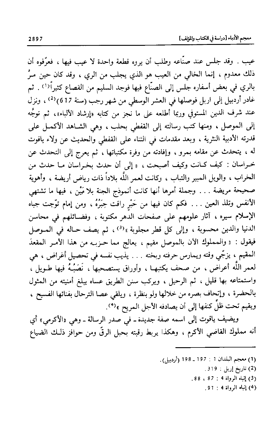 عيب. وقد جلس عند صنّاعه وطلب أن يروه قطعة واحدة لا عيب فيها، فعرّفوه أن ذلك معدوم، إنما الخالي من العيب هو الذي يجلب من الري، وقد كان حين مرّ بالري في بعض أسفاره جلس إلى الصنّاع فيها فوجد السليم من القصاع كثيرا «1» . ثم غادر أردبيل إلى اربل فوصلها في العشر الوسطي من شهر رجب (سنة 617) «2» ، ونزل عند شرف الدين المستوفي وربما أطلعه على ما نجز من كتابه «إرشاد الألباء» ، ثم توجّه إلى الموصل، ومنها كتب رسالته إلى القفطي بحلب، وهي الشاهد الأكمل على قدرته الأدبية النثرية، وبعد مقدمات في الثناء على القفطي والحديث عن ولاء ياقوت له، يتحدث عن مقامه بمرو، وإفادته من وفرة مكتباتها، ثم يعرج إلى التحدث عن خراسان: كيف كانت وكيف أصبحت، «إلى أن حدث بخراسان ما حدث من الخراب، والويل المبير والتباب، وكانت لعمر الله بلادا ذات رياض أريضة، وأهوية صحيحة مريضة ... وجملة أمرها أنها كانت أنموذج الجنة بلا مين، فيها ما تشتهي الأنفس وتلذ العين ... فكم كان فيها من حبر راقت حبره، ومن إمام توّجت جباه الإسلام سيره، آثار علومهم على صفحات الدهر مكتوبة، وفضائلهم في محاسن الدنيا والدين محسوبة، وإلى كل قطر مجلوبة» «3» ، ثم يصف حاله في الموصل فيقول: «والمملوك الآن بالموصل مقيم، يعالج مما حزبه من هذا الأمر المقعد المقيم، يزجّي وقته ويمارس حرفته وبخته ... يذيب نفسه في تحصيل أغراض، هي لعمر الله أعراض، من صحف يكتبها، وأوراق يستصحبها، نصبه فيها طويل، واستمتاعه بها قليل، ثم الرحيل، ويركب سنن الطريق عساه يبلغ أمنيته من المثول بالحضرة، وإتحاف بصره من خلالها ولو بنظرة، ويلقي عصا الترحال بفنائها الفسيح، ويقيم تحت ظلّ كنفها إلى أن يصادفه الأجل المريح» «4» .