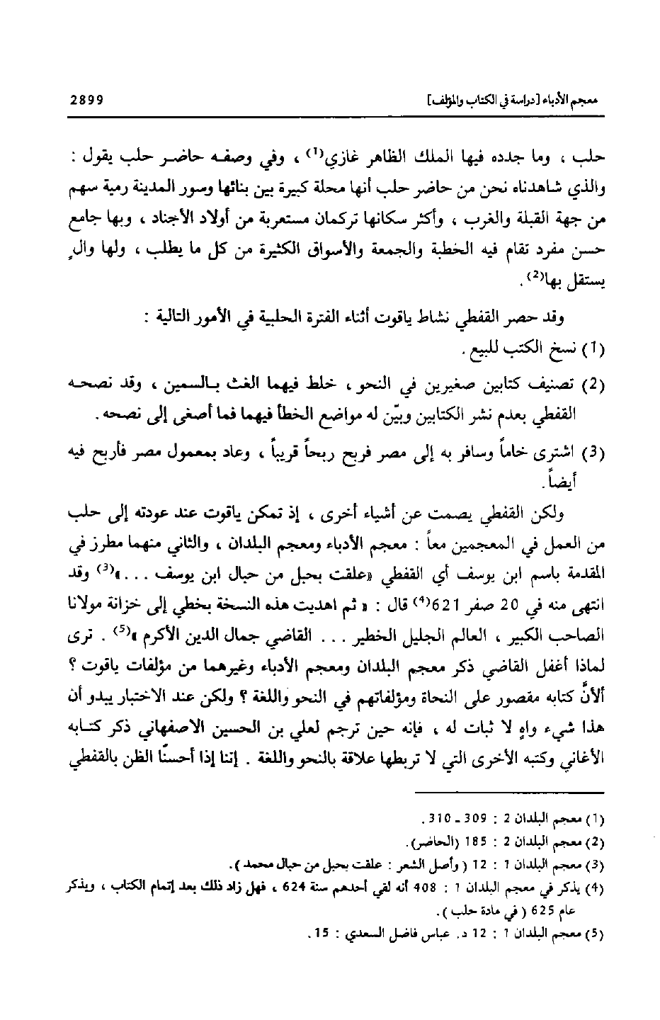ولكن القفطي يصمت عن أشياء أخرى، إذ تمكن ياقوت عند عودته إلى حلب من العمل في المعجمين معا: معجم الأدباء ومعجم البلدان، والثاني منهما مطرز في المقدمة باسم ابن يوسف أي القفطي «علقت بحبل من حبال ابن يوسف ... » «3» وقد انتهى منه في 20 صفر 621 «4» قال: «ثم اهديت هذه النسخة بخطي إلى خزانة مولانا الصاحب الكبير، العالم الجليل الخطير ... القاضي جمال الدين الأكرم» «5» . ترى لماذا أغفل القاضي ذكر معجم البلدان ومعجم الأدباء وغيرهما من مؤلفات ياقوت؟