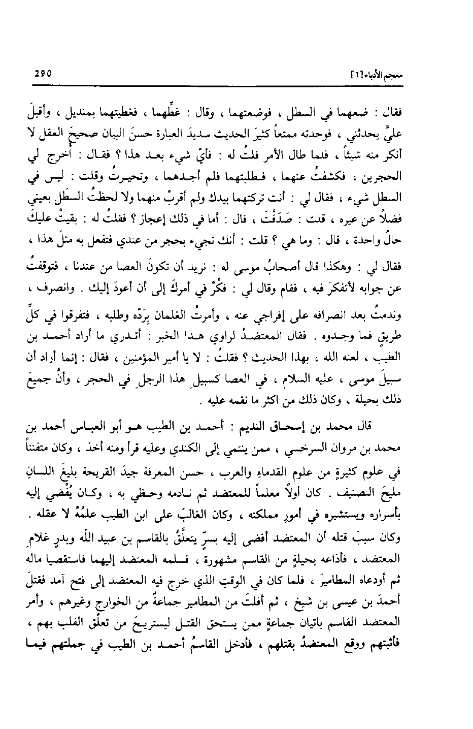 فقال: ضعهما في السطل، فوضعتهما، وقال: غطّهما، فغطيتهما بمنديل، وأقبل عليّ يحدثني، فوجدته ممتعا كثير الحديث سديد العبارة حسن البيان صحيح العقل لا أنكر منه شيئا، فلما طال الأمر قلت له: فأيّ شيء بعد هذا؟ فقال: أخرج لي الحجرين، فكشفت عنهما، فطلبتهما فلم أجدهما، وتحيرت وقلت: ليس في السطل شيء، فقال لي: أنت تركتهما بيدك ولم أقرب منهما ولا لحظت السطل بعيني فضلا عن غيره، قلت: صدقت، قال: أما في ذلك إعجاز؟ فقلت له: بقيت عليك حال واحدة، قال: وما هي؟ قلت: أنك تجيء بحجر من عندي فتفعل به مثل هذا، فقال لي: وهكذا قال أصحاب موسى له: نريد أن تكون العصا من عندنا، فتوقفت عن جوابه لأتفكر فيه، فقام وقال لي: فكّر في أمرك إلى أن أعود إليك. وانصرف، وندمت بعد انصرافه على إفراجي عنه، وأمرت الغلمان بردّه وطلبه، فتفرقوا في كلّ طريق فما وجدوه. فقال المعتضد لراوي هذا الخبر: أتدري ما أراد أحمد بن الطيب، لعنه الله، بهذا الحديث؟ فقلت: لا يا أمير المؤمنين، فقال: إنما أراد أن سبيل موسى، عليه السلام، في العصا كسبيل هذا الرجل في الحجر، وأنّ جميع ذلك بحيلة، وكان ذلك من اكثر ما نقمه عليه.