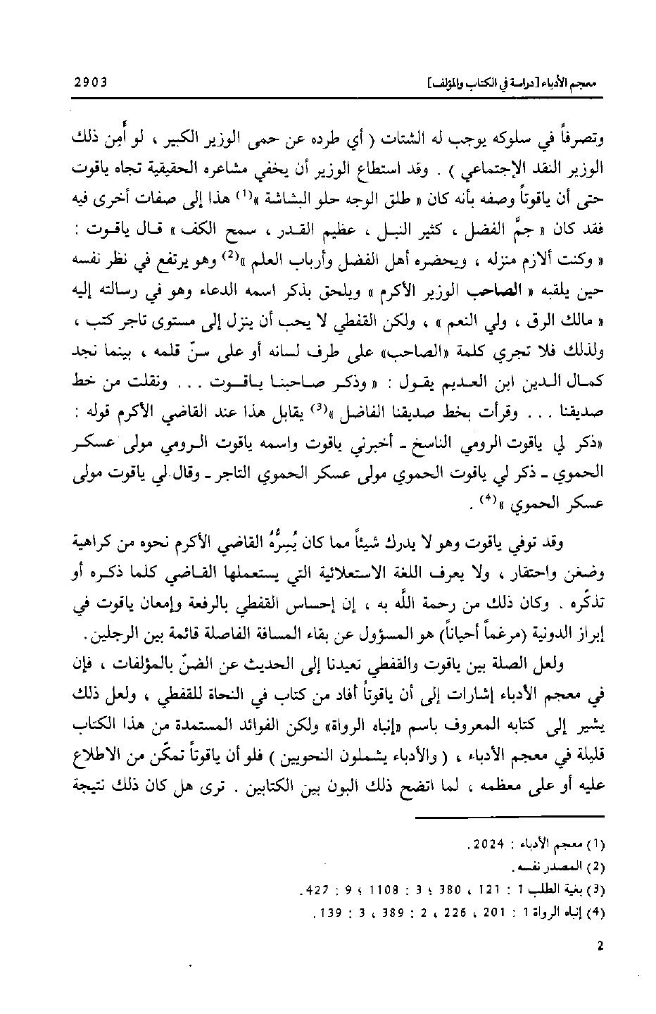 ولعل الصلة بين ياقوت والقفطي تعيدنا إلى الحديث عن الضنّ بالمؤلفات، فإن في معجم الأدباء إشارات إلى أن ياقوتا أفاد من كتاب في النحاة للقفطي، ولعل ذلك يشير إلى كتابه المعروف باسم «إنباه الرواة» ولكن الفوائد المستمدة من هذا الكتاب قليلة في معجم الأدباء، (والأدباء يشملون النحويين) فلو أن ياقوتا تمكّن من الاطلاع عليه أو على معظمه، لما اتضح ذلك البون بين الكتابين. ترى هل كان ذلك نتيجة