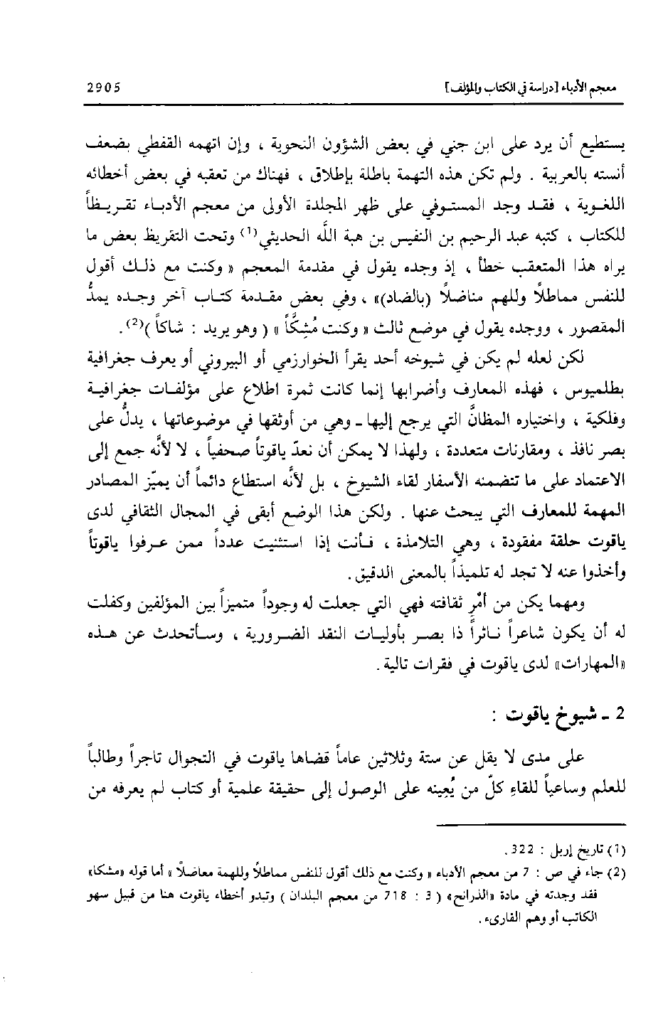 ومهما يكن من أمر ثقافته فهي التي جعلت له وجودا متميزا بين المؤلفين وكفلت له أن يكون شاعرا ناثرا ذا بصر بأوليات النقد الضرورية، وسأتحدث عن هذه «المهارات» لدى ياقوت في فقرات تالية.