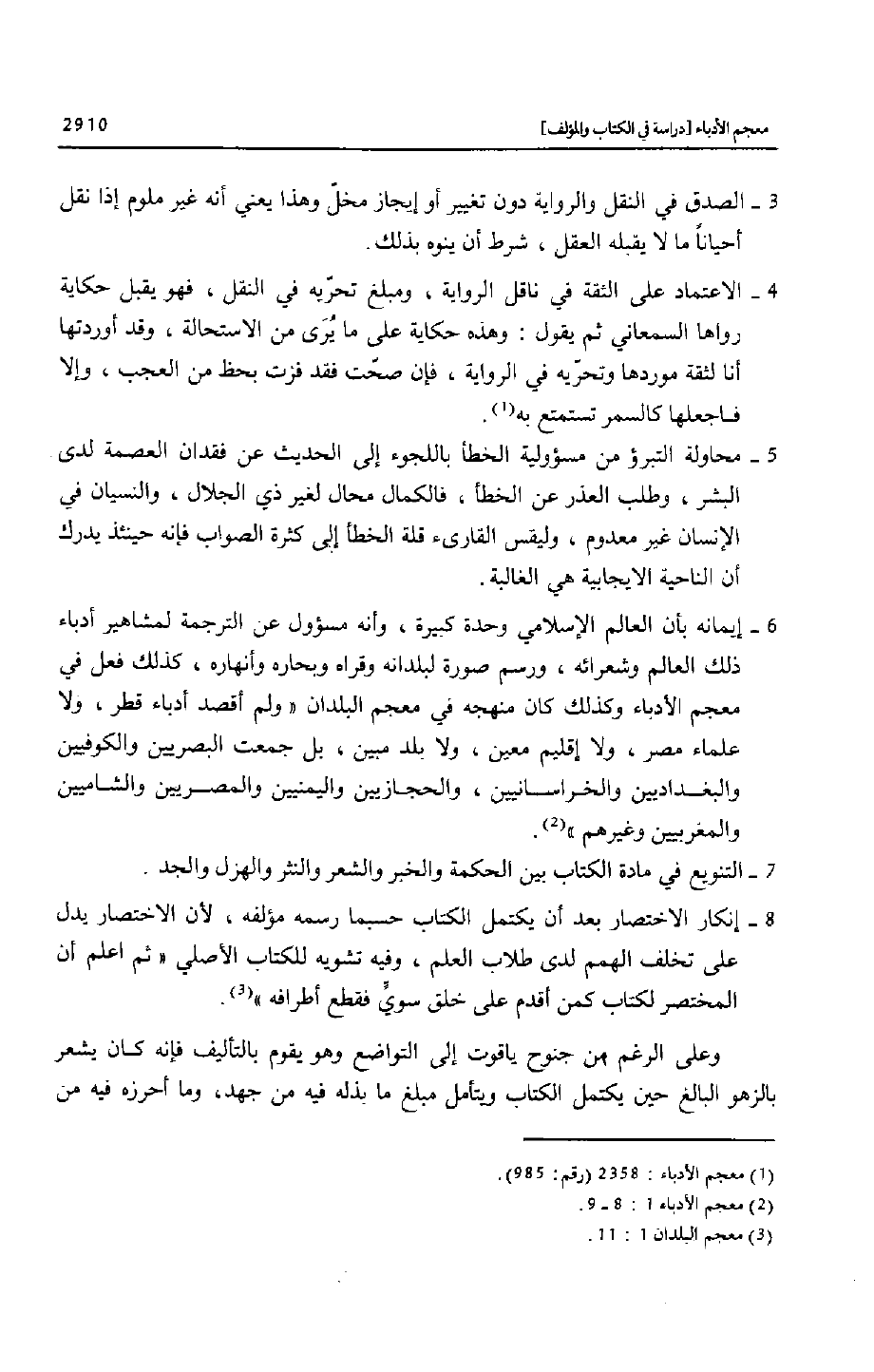 6- إيمانه بأن العالم الإسلامي وحدة كبيرة، وأنه مسؤول عن الترجمة لمشاهير أدباء ذلك العالم وشعرائه، ورسم صورة لبلدانه وقراه وبحاره وأنهاره، كذلك فعل في معجم الأدباء وكذلك كان منهجه في معجم البلدان «ولم أقصد أدباء قطر، ولا علماء مصر، ولا إقليم معين، ولا بلد مبين، بل جمعت البصريين والكوفيين والبغداديين والخراسانيين، والحجازيين واليمنيين والمصريين والشاميين والمغربيين وغيرهم» «2» .