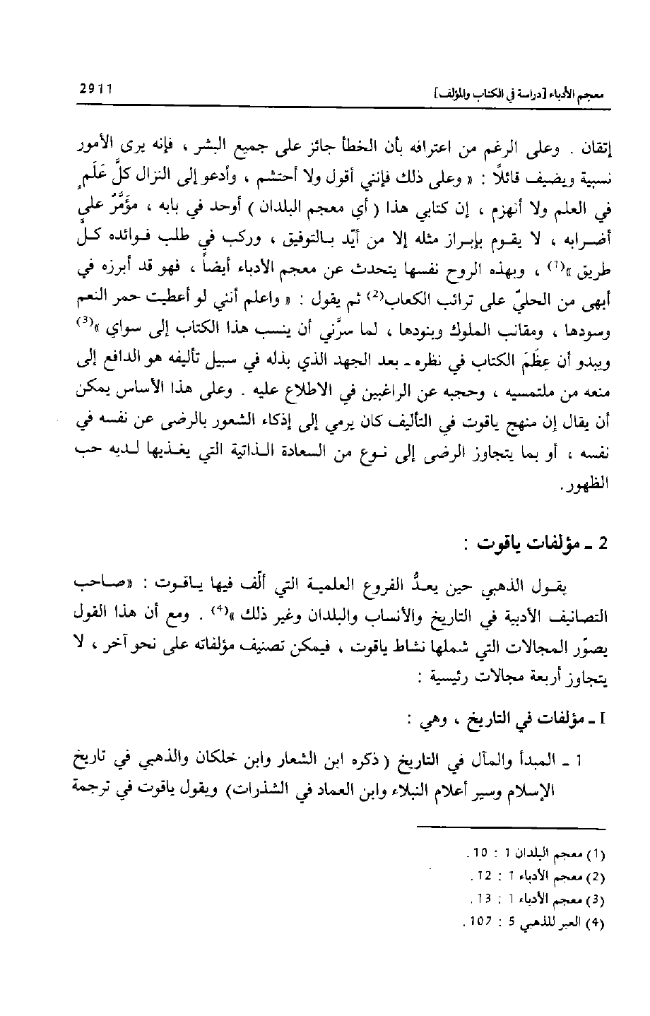 إتقان. وعلى الرغم من اعترافه بأن الخطأ جائز على جميع البشر، فإنه يرى الأمور نسبية ويضيف قائلا: «وعلى ذلك فإنني أقول ولا أحتشم، وأدعو إلى النزال كلّ علم في العلم ولا أنهزم، إن كتابي هذا (أي معجم البلدان) أوحد في بابه، مؤمّر على أضرابه، لا يقوم بإبراز مثله إلا من أيّد بالتوفيق، وركب في طلب فوائده كلّ طريق» «1» ، وبهذه الروح نفسها يتحدث عن معجم الأدباء أيضا، فهو قد أبرزه في أبهى من الحليّ على ترائب الكعاب «2» ثم يقول: «واعلم أنني لو أعطيت حمر النعم وسودها، ومقانب الملوك وبنودها، لما سرّني أن ينسب هذا الكتاب إلى سواي» «3» ويبدو أن عظم الكتاب في نظره- بعد الجهد الذي بذله في سبيل تأليفه هو الدافع إلى منعه من ملتمسيه، وحجبه عن الراغبين في الاطلاع عليه. وعلى هذا الأساس يمكن أن يقال إن منهج ياقوت في التأليف كان يرمي إلى إذكاء الشعور بالرضى عن نفسه في نفسه، أو بما يتجاوز الرضى إلى نوع من السعادة الذاتية التي يغذيها لديه حب الظهور.