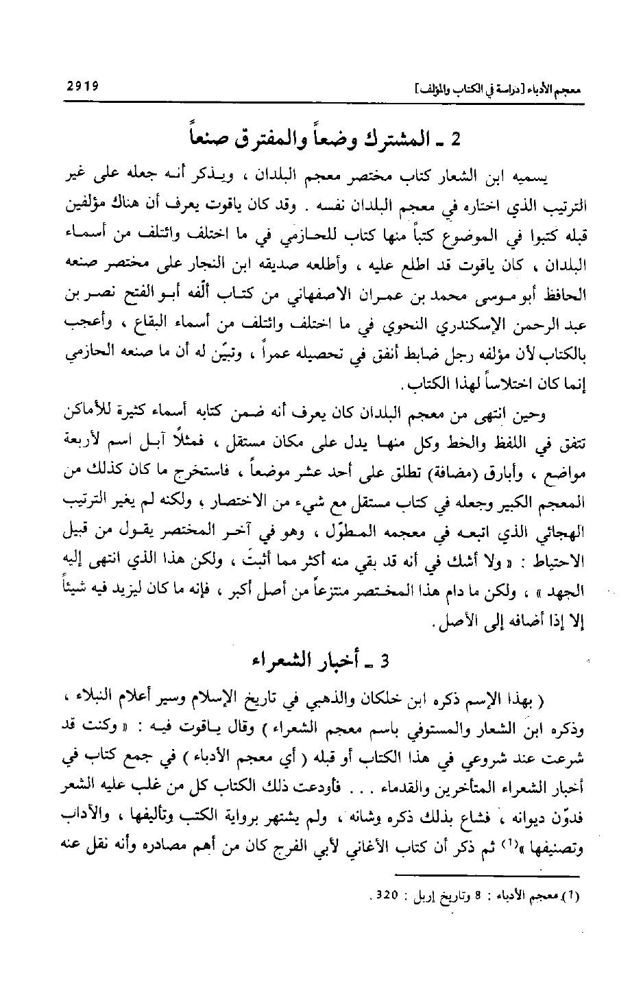 (بهذا الإسم ذكره ابن خلكان والذهبي في تاريخ الإسلام وسير أعلام النبلاء، وذكره ابن الشعار والمستوفي باسم معجم الشعراء) وقال ياقوت فيه: «وكنت قد شرعت عند شروعي في هذا الكتاب أو قبله (أي معجم الأدباء) في جمع كتاب في أخبار الشعراء المتأخرين والقدماء ... فأودعت ذلك الكتاب كل من غلب عليه الشعر فدوّن ديوانه، فشاع بذلك ذكره وشانه، ولم يشتهر برواية الكتب وتأليفها، والآداب وتصنيفها» «1» ثم ذكر أن كتاب الأغاني لأبي الفرج كان من أهم مصادره وأنه نقل عنه