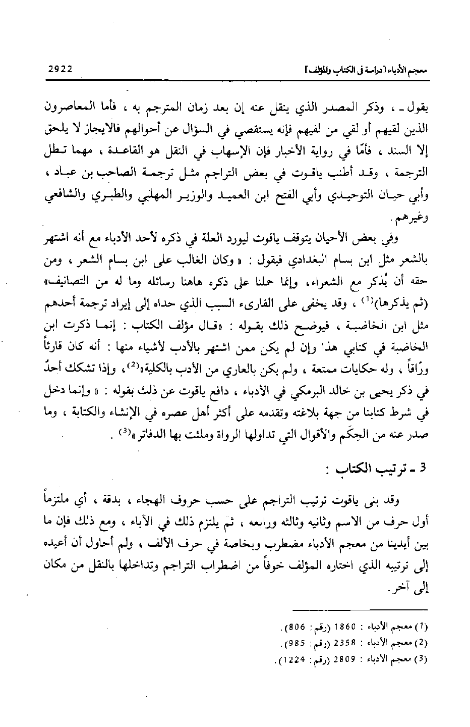 يقول-، وذكر المصدر الذي ينقل عنه إن بعد زمان المترجم به، فأما المعاصرون الذين لقيهم أو لقي من لقيهم فإنه يستقصي في السؤال عن أحوالهم فالايجاز لا يلحق إلا السند، فأمّا في رواية الأخبار فإن الإسهاب في النقل هو القاعدة، مهما تطل الترجمة، وقد أطنب ياقوت في بعض التراجم مثل ترجمة الصاحب بن عباد، وأبي حيان التوحيدي وأبي الفتح ابن العميد والوزير المهلبي والطبري والشافعي وغيرهم.