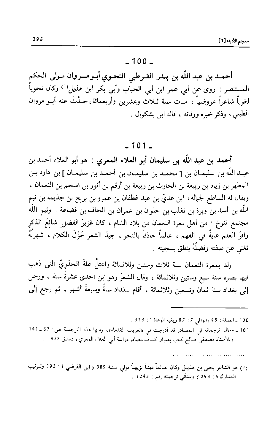[101]- معظم ترجماته في المصادر قد أدرجت في «تعريف القدماء» ، ومنها هذه الترجمة ص: 67- 141 وللأستاذ مصطفى صالح كتاب بعنوان كشاف مصادر دراسة أبي العلاء المعري، دمشق 1978.