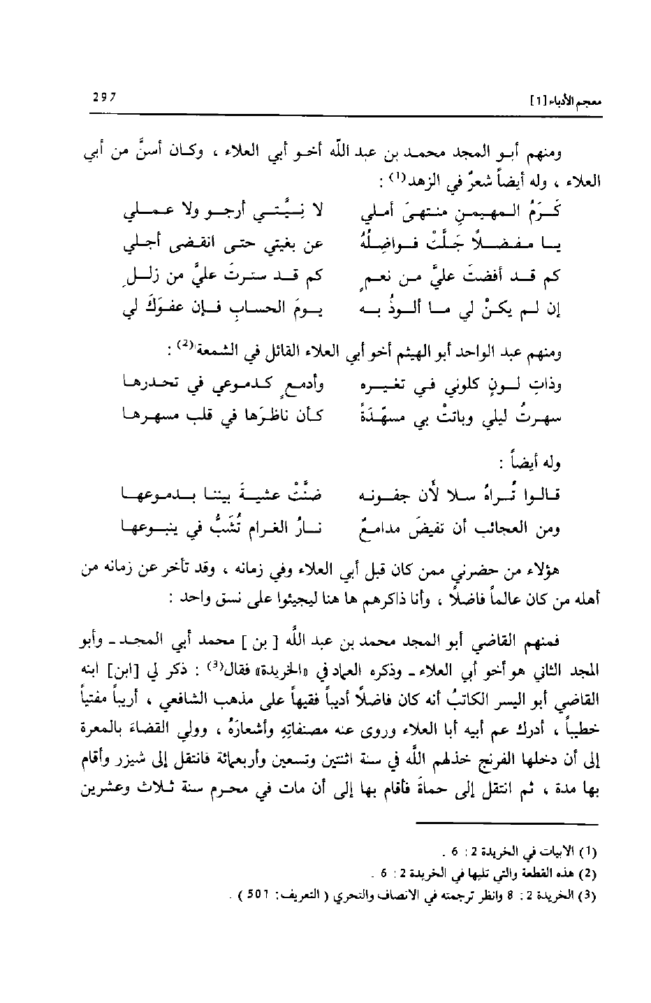 فمنهم القاضي أبو المجد محمد بن عبد الله [بن] محمد أبي المجد- وأبو المجد الثاني هو أخو أبي العلاء- وذكره العماد في «الخريدة» فقال [3] : ذكر لي [ابن] ابنه القاضي أبو اليسر الكاتب أنه كان فاضلا أديبا فقيها على مذهب الشافعي، أريبا مفتيا خطيبا، أدرك عم أبيه أبا العلاء وروى عنه مصنفاته وأشعاره، وولي القضاء بالمعرة إلى أن دخلها الفرنج خذلهم الله في سنة اثنتين وتسعين وأربعمائة فانتقل إلى شيزر وأقام بها مدة، ثم انتقل إلى حماة فأقام بها إلى أن مات في محرم سنة ثلاث وعشرين