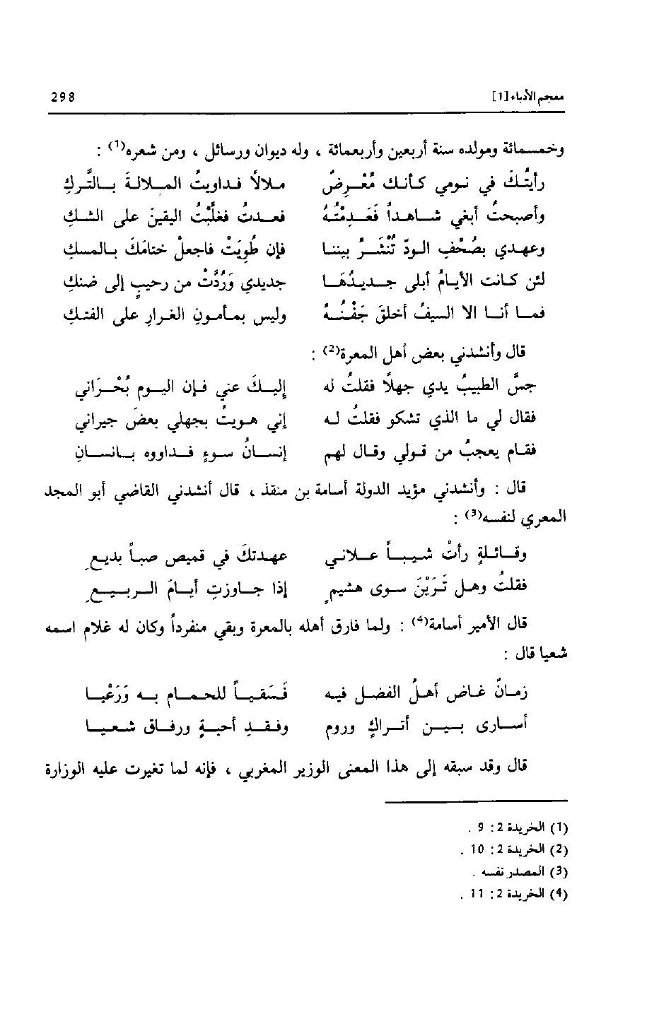 قال: وأنشدني مؤيد الدولة أسامة بن منقذ، قال أنشدني القاضي أبو المجد المعري لنفسه [3] :